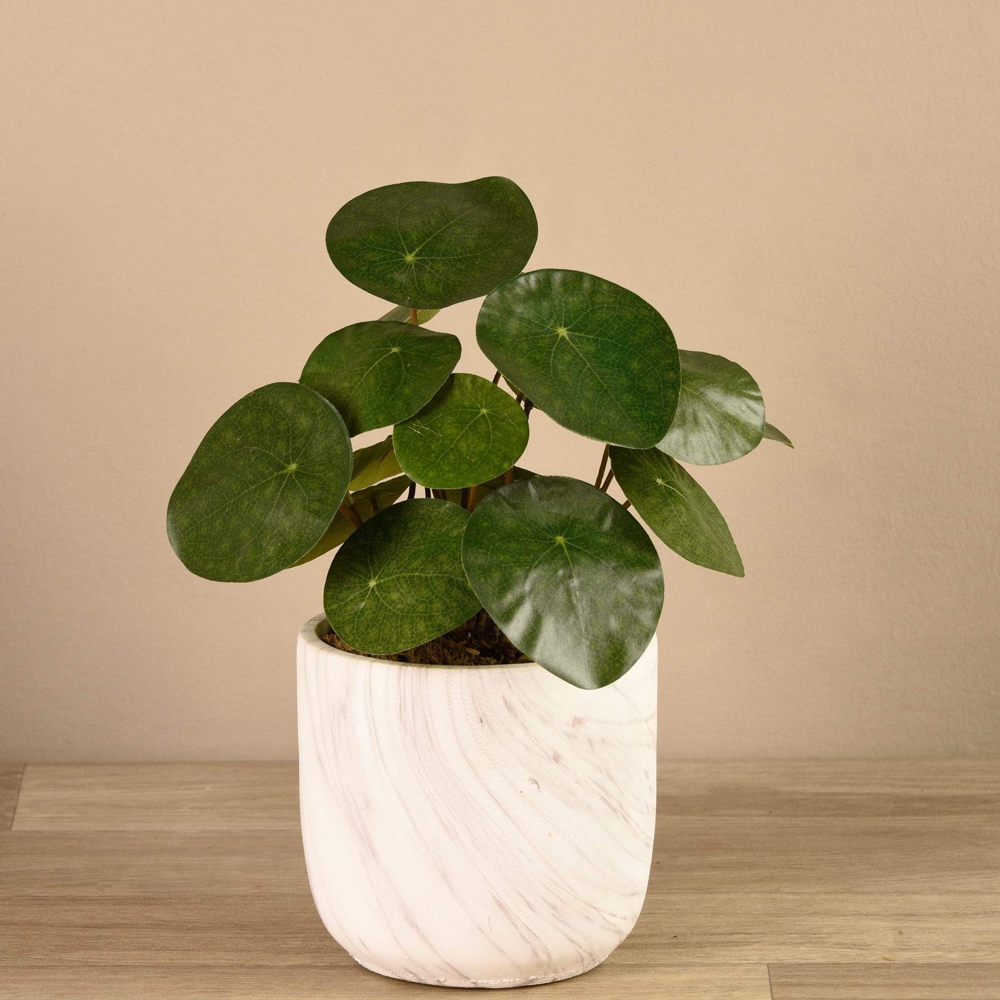 المعروف أيضًا باسم نبات المال الصيني، يعد هذا النبات الصناعي الشبيه بالحقيقي من نوع بان كيك وسيلة رائعة لإضفاء لمسة من اللون الأخضر على غرفة المعيشة وربما حتى إضافة بعض النقود إلى محفظتك. أوراقه الخضراء الدائرية تبرز بشكل رائع ضد الوعاء المرمري الأبيض والرمادي.