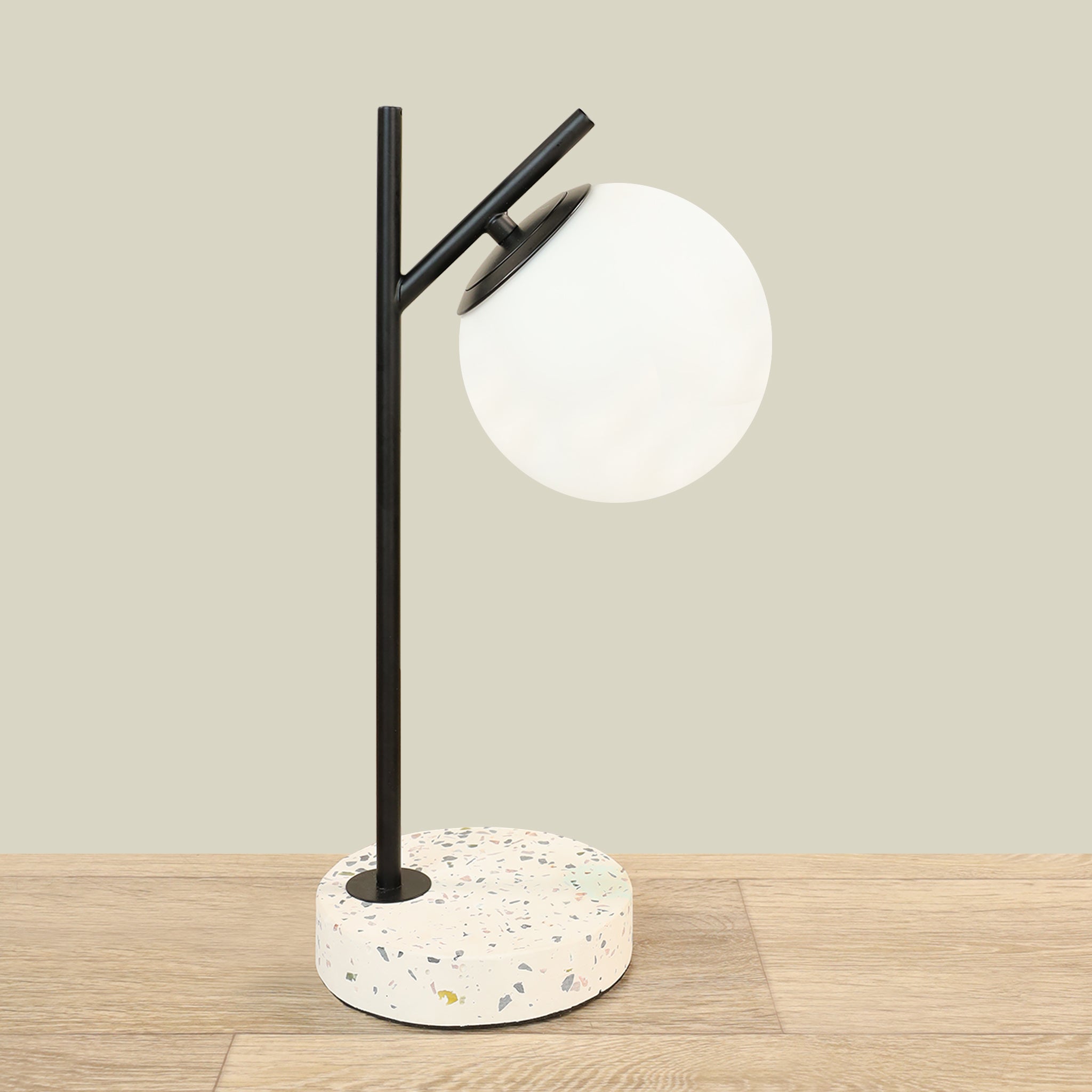 Discover architectural elegance with this table lamp, where premium glass and terrazzo converge in a striking white and black design.