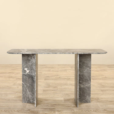 تتميز طاولة الكونسول "ترينتينو" بخطوط أنيقة وتصميم بسيط يبرز جمال الرخام الفاخر كعنصر رئيسي. تقف الأرجل الرفيعة المتوازية مع الجزء العلوي، مما يضيف لمسة جمالية دون تشتيت الانتباه.