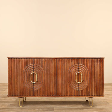 تصميم منحني على الواجهة يتناغم مع الأرجل على شكل حرف U، مما يمنح هذه الخزانة الجانبية الخشبية مظهرًا متناغمًا وأنيقًا. مصنوعة من خشب لامع وجميل، تتميز الخزانة بأربعة أبواب توفر سهولة الوصول إلى مساحة التخزين الداخلية، بالإضافة إلى واجهات ذات ملمس مميز تضيف لمسة جمالية إلى غرفة المعيشة أو الطعام.