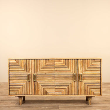 أضف مساحة تخزين واسعة وغير مرئية إلى غرفة المعيشة أو الطعام الخاصة بك مع هذه الخزانة الجانبية الخشبية العصرية. مصنوعة بتصميم هندسي على الواجهة ومقابض معدنية متناسقة، توفر هذه الخزانة مساحة تنظيمية وفيرة مع لمسة أنيقة تضيف جاذبية إلى أي ديكور.