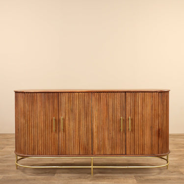 يتميز هذا البوفيه الجانبي بتصميم ملتف يجمع بشكل مثالي بين أنماط آرت ديكو والطراز العصري لمنتصف القرن، ليمنح مظهراً عصرياً وأنيقاً. مع تصميم بنمط رأسي يعكسه مقابض معدنية أنيقة، يوفر هذا البوفيه الخشبي مساحة تخزين واسعة ولمسة راقية تضيف جمالاً لأي مساحة.