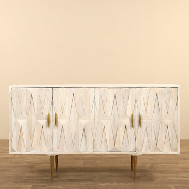 تصميم مستوحى من الطراز العصري لمنتصف القرن يزين واجهة هذا البوفيه الأنيق بنمط ماسي. مصنوع من الخشب الصلب لضمان المتانة والمظهر الجميل الذي يدوم طويلاً، مع توفير مساحة تخزين عملية. تدعمه أرجل معدنية لامعة تضيف لمسة أنيقة وترفع التصميم ليكون مناسباً للاستخدام في أي غرفة داخل المنزل.