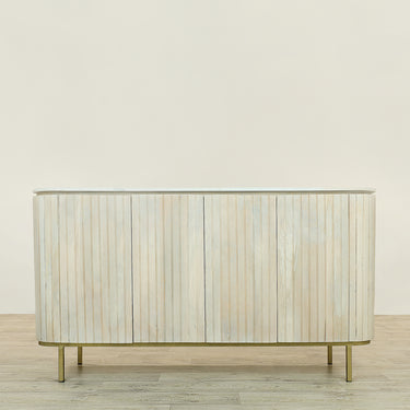 هذا البوفيه الجانبي المستوحى من الطراز العصري لمنتصف القرن يجمع بين العناصر الكلاسيكية والمعاصرة في تصميم أنيق ومتقن. يتميز بحواف مستديرة تضفي إحساسًا بالأناقة الخالدة، مع تفاصيل رأسية تضيف لمسة من التميز البصري. السطح العلوي مصنوع من رخام أبيض نقي، يكتمل بجمال مع اللمسات المعدنية المصنوعة من الحديد الأنيق. يوفر البوفيه مساحة تخزين واسعة مع أربعة أبواب تكشف عن رف داخلي مثالي لتنظيم احتياجاتك. بلمسة نهائية من خشب البلوط الأبيض الغني، يجسد هذا البوفيه الفخامة البسيطة ويعمل كقطعة محورية مذهلة في أي مساحة.