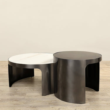 Crafted in stainless steel for industrial flair this set of coffee tables has wonderfully rounded shapes for use from all sides. Sintered stone tops complement the stainless bases perfectly, offering sleek and contemporary style for a conversation area.