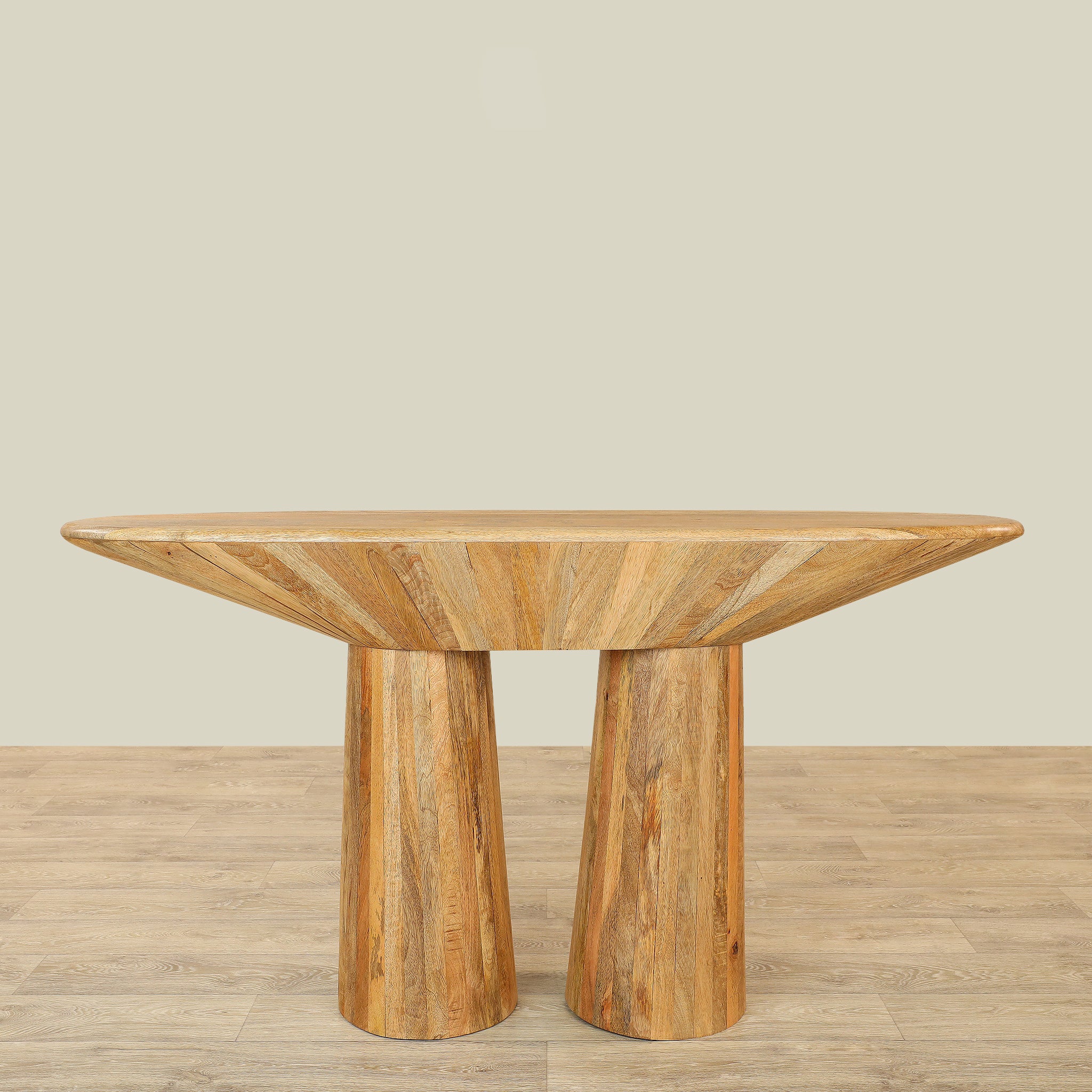 This exquisite wooden console table showcases a distinctive oval form that commands attention with quiet sophistication.
