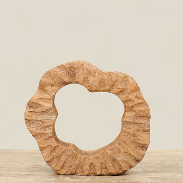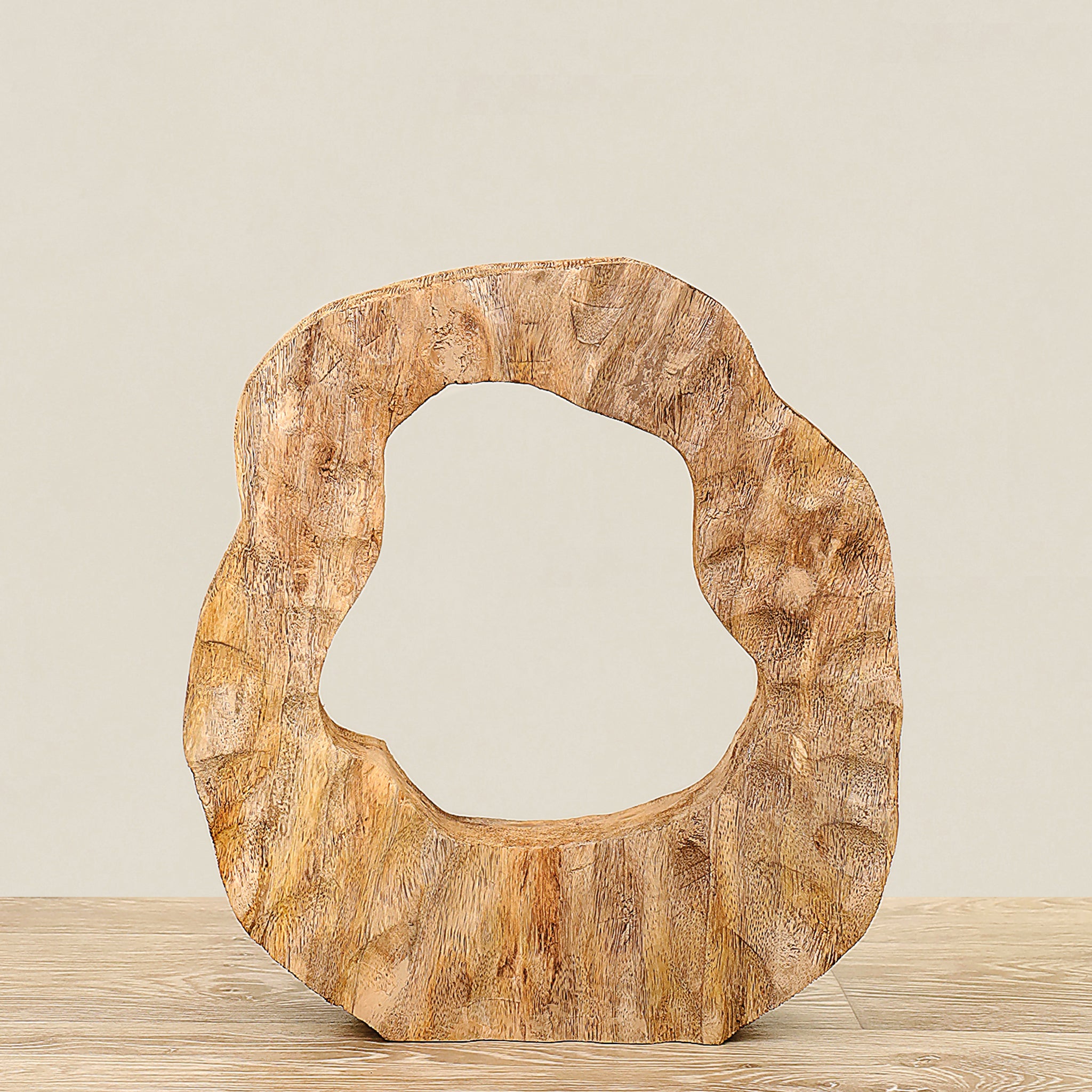The Chiseled Log Sculpture is a captivating piece crafted from mango wood, celebrated for its natural beauty and durability. This sculpture takes on a circular form, embodying the rugged and organic essence of the material. Each piece is carefully chiseled, highlighting the unique grain patterns and textures inherent in mango wood, making every sculpture a one-of-a-kind work of art.