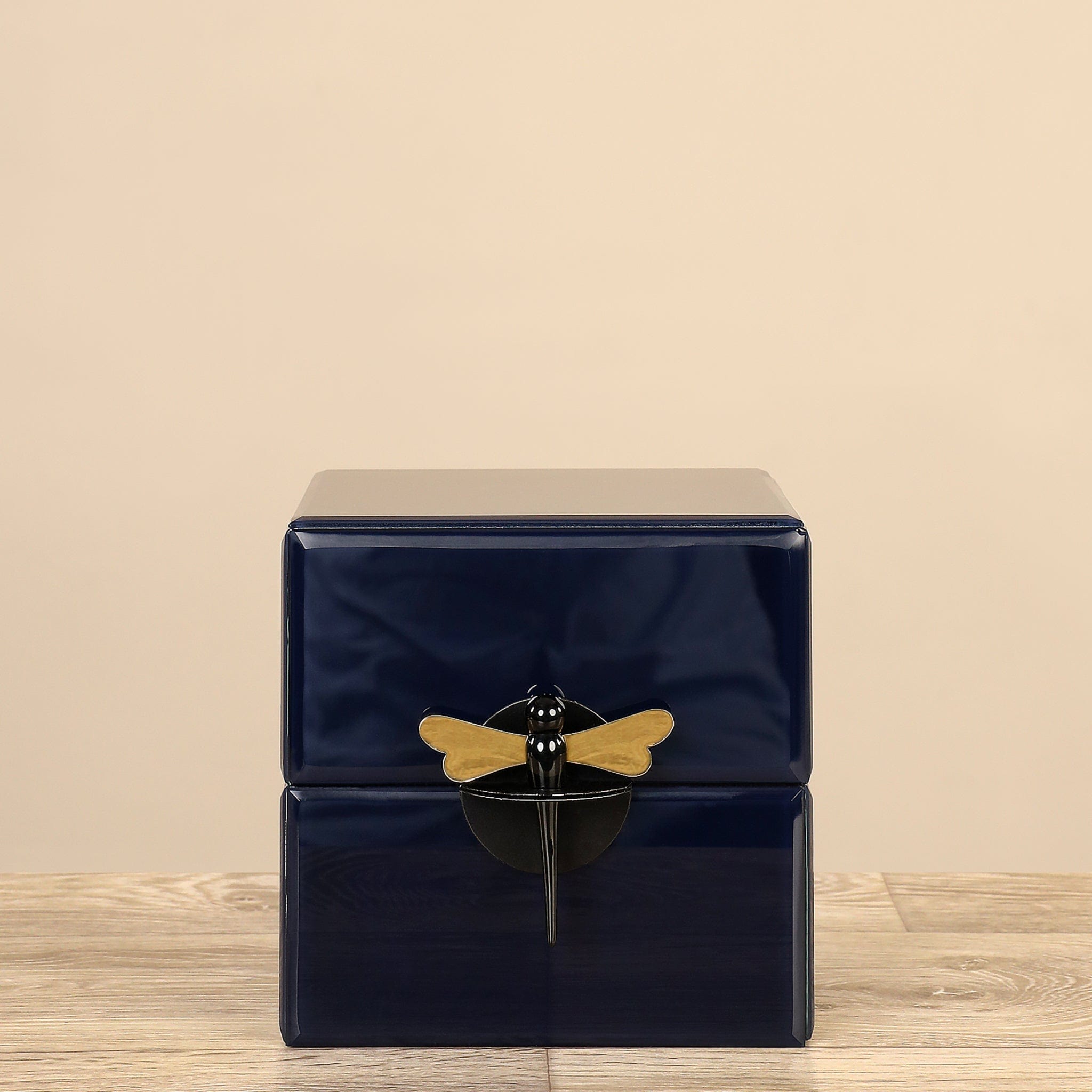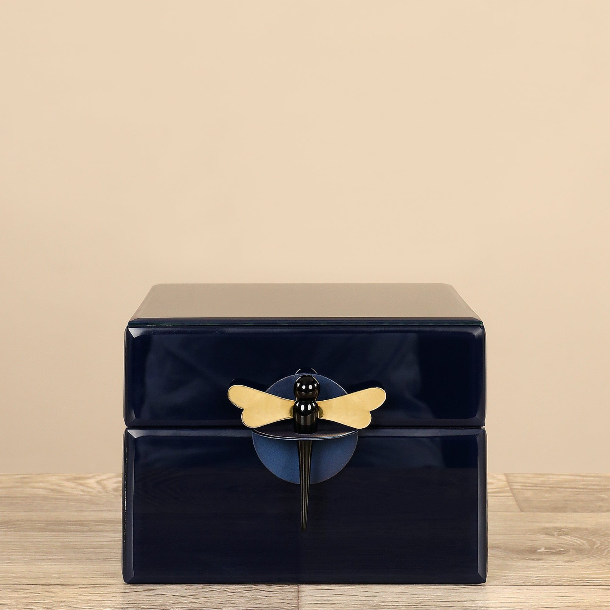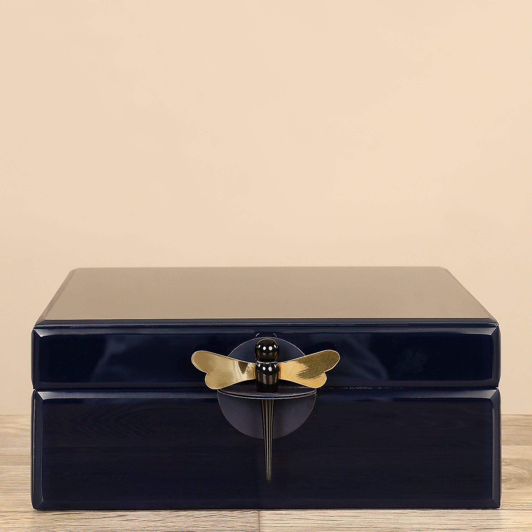 Adorned with a glossy navy blue finish, this elegant Jewelry Box boasts a distinctive dragonfly clasp that sets it apart. With its perfect size for accommodating everything from precious jewelry to cherished mementos, this sleek box is guaranteed to add appeal to any surface.