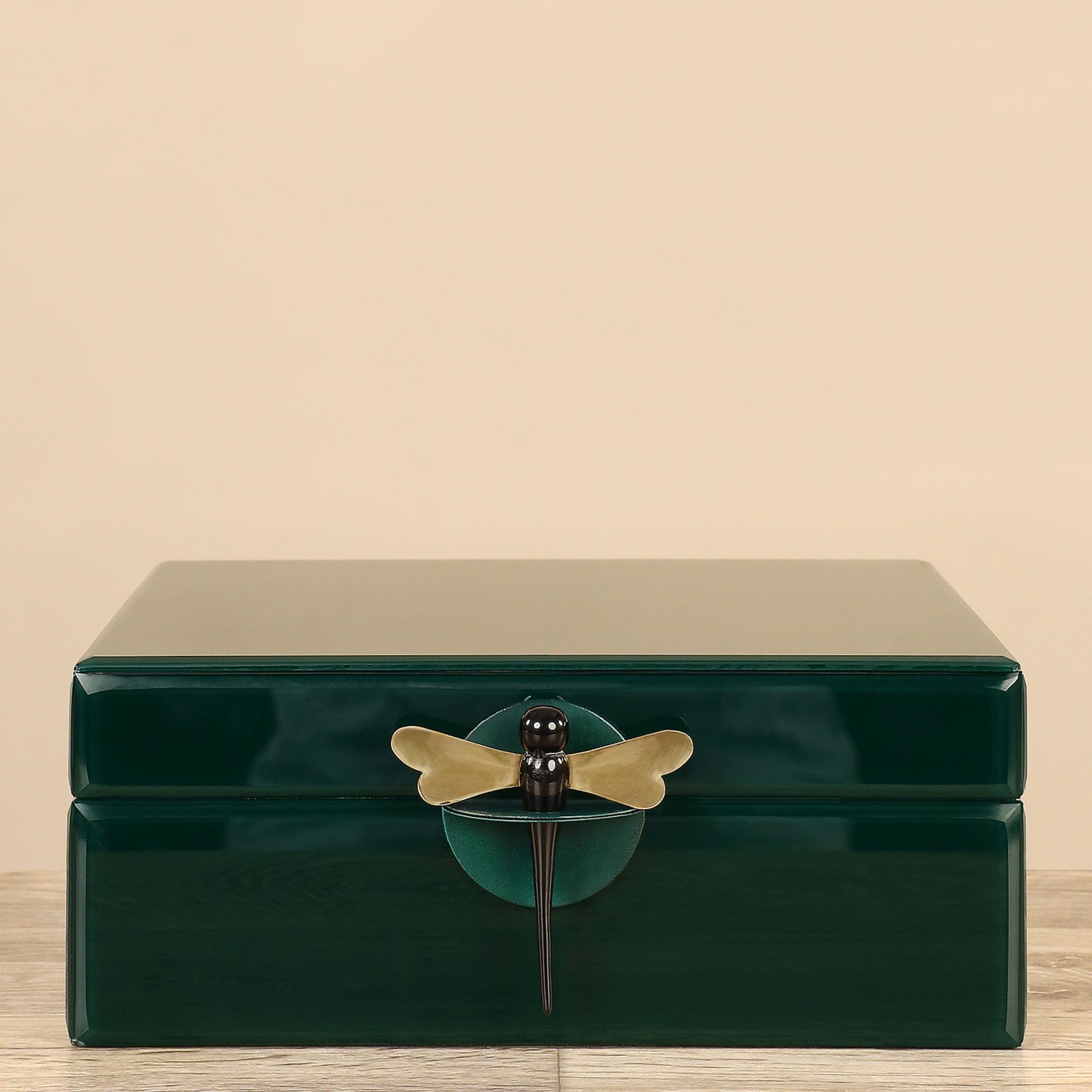 Adorned with a glossy and brilliant bottle green finish, this elegant Jewelry Box boasts a distinctive dragonfly clasp that sets it apart. With its perfect size for accommodating everything from precious jewelry to cherished mementos, this sleek box is guaranteed to add appeal to any surface.