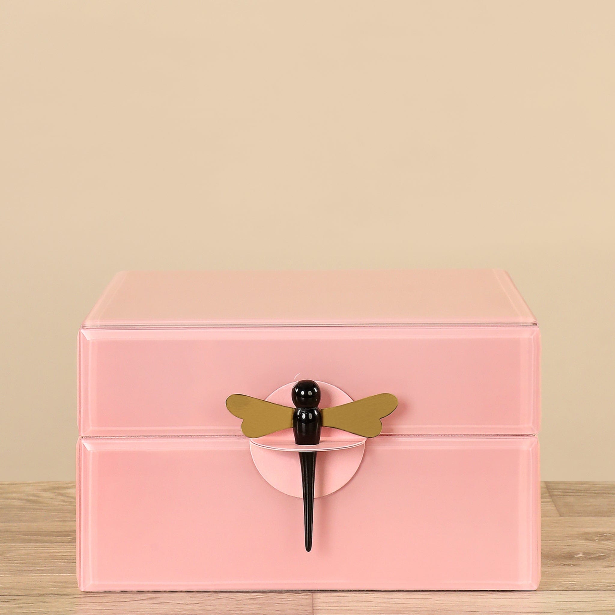 Adorned with a glossy and charming pink finish, this elegant Jewelry Box boasts a distinctive dragonfly clasp that sets it apart. With its perfect size for accommodating everything from precious jewelry to cherished mementos, this sleek box is guaranteed to add appeal to any surface.