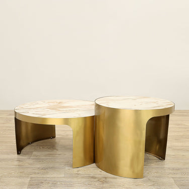 The Weathon Coffee Table Set offers chic style that effortlessly elevates any living space. The set is crafted with a gold-brushed stainless steel frame, providing a subtle gleam that enhances its sophisticated look. The top is made from high-quality sintered stone, known for its durability and elegant appearance. The tables boast a stylish curved design, which adds a touch of contemporary flair, and the open base creates a sense of space and lightness. This combination of materials and design elements results in a luxurious and eye-catching coffee table set perfect for modern interiors.