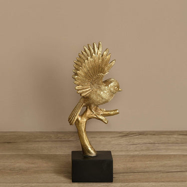 Strong, elegant, and charming. This bird figurine features intricate feather carvings, a metallic gold finish, and a contrasting black base for ease of display. Place it on your office shelf for a stylish accent.