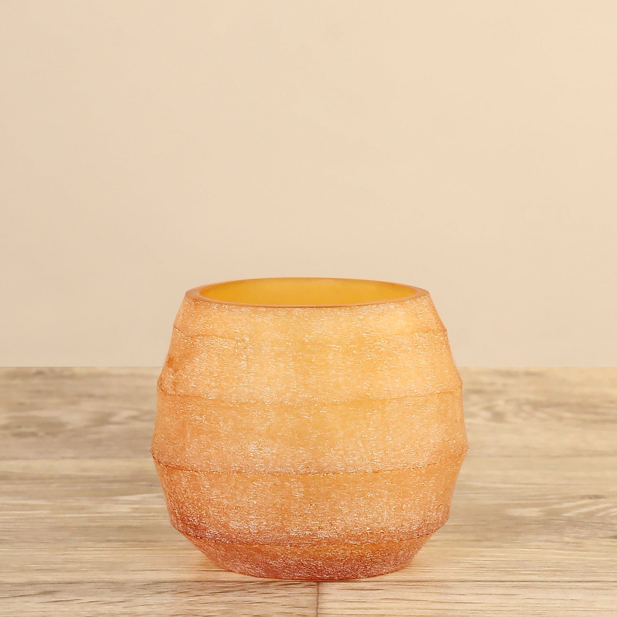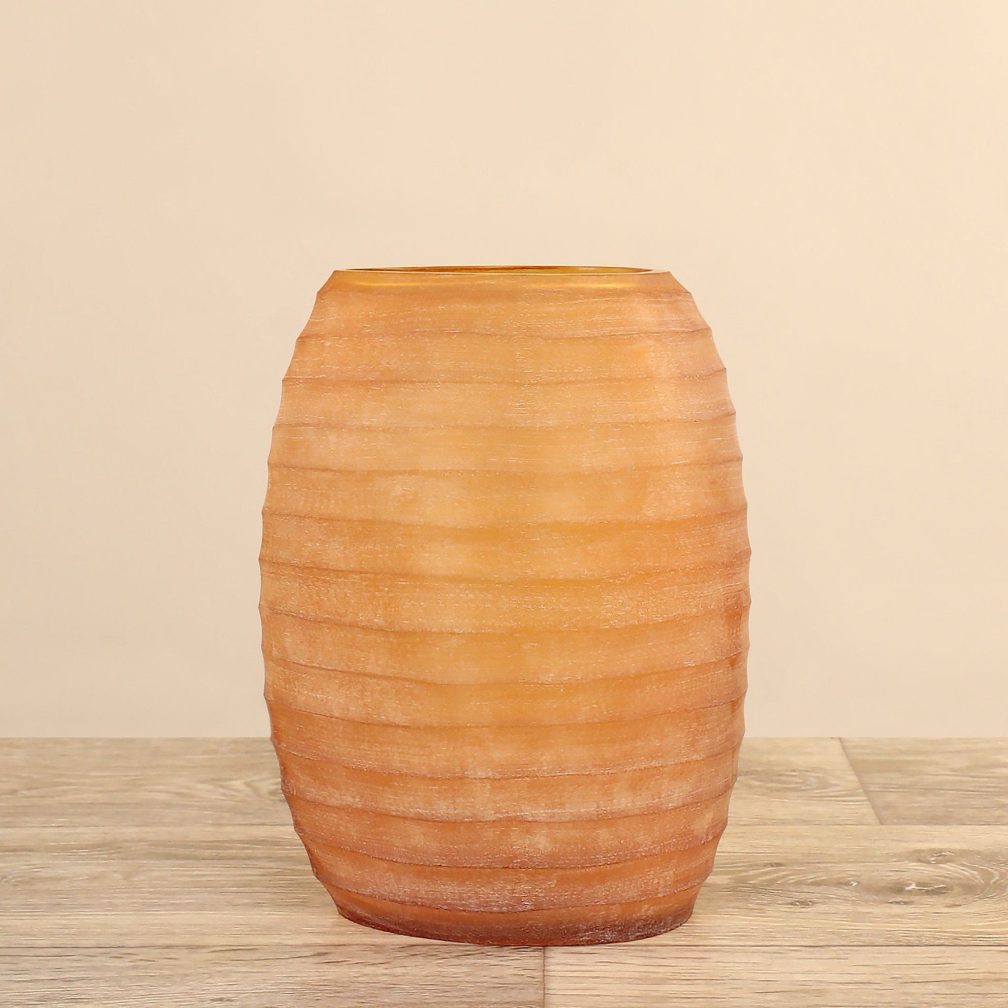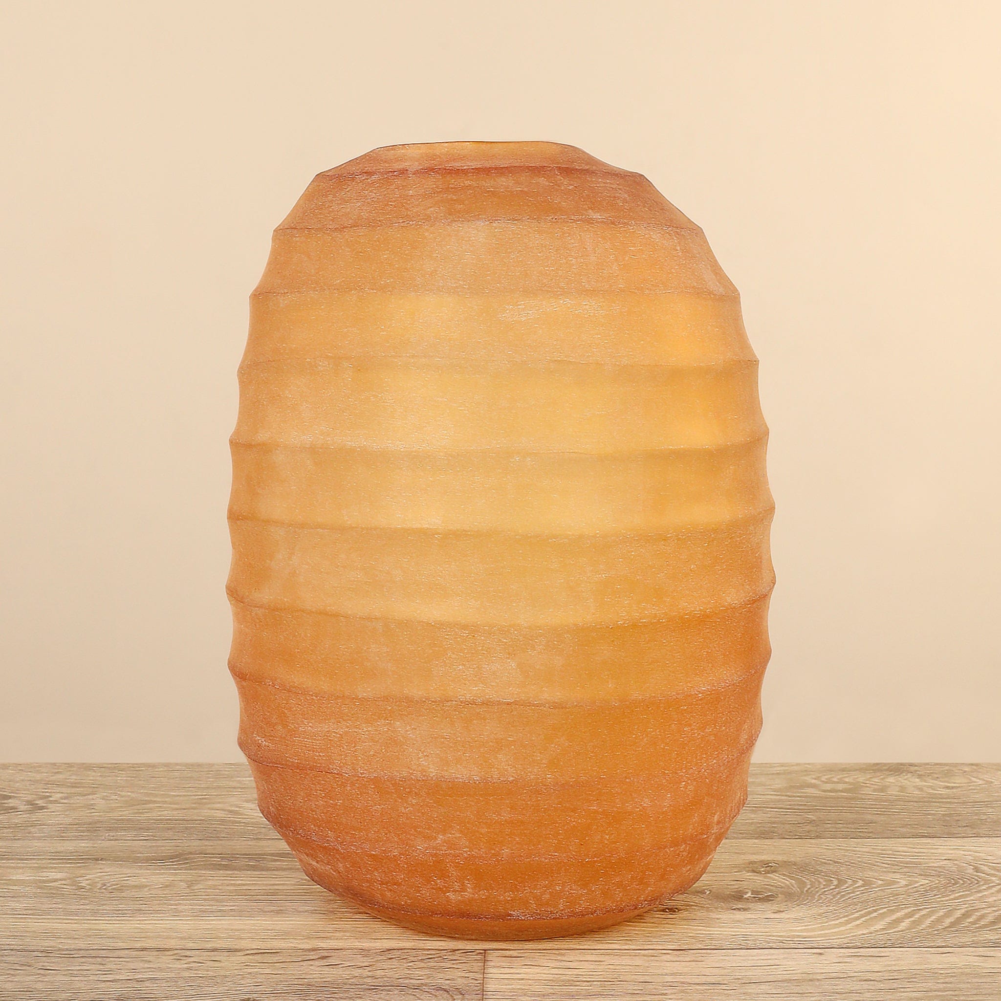 Beautiful as a decorative object this Handblown Glass Vase is equally stunning displaying artificial or real flowers. Crafted with a cheerful yellow finish with horizontal ribbing, this elegant glass vase is a wonderful way to bring color and texture into a decorating aesthetic.