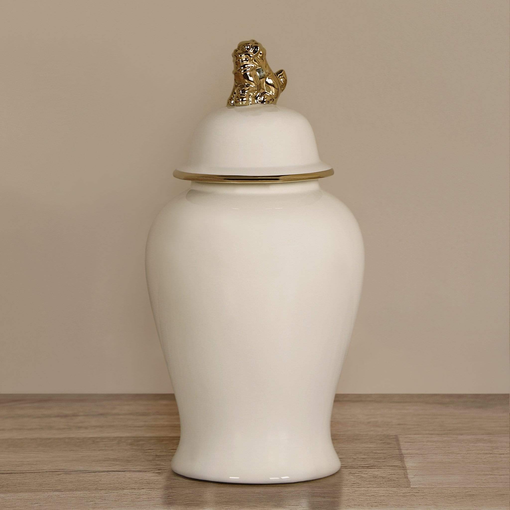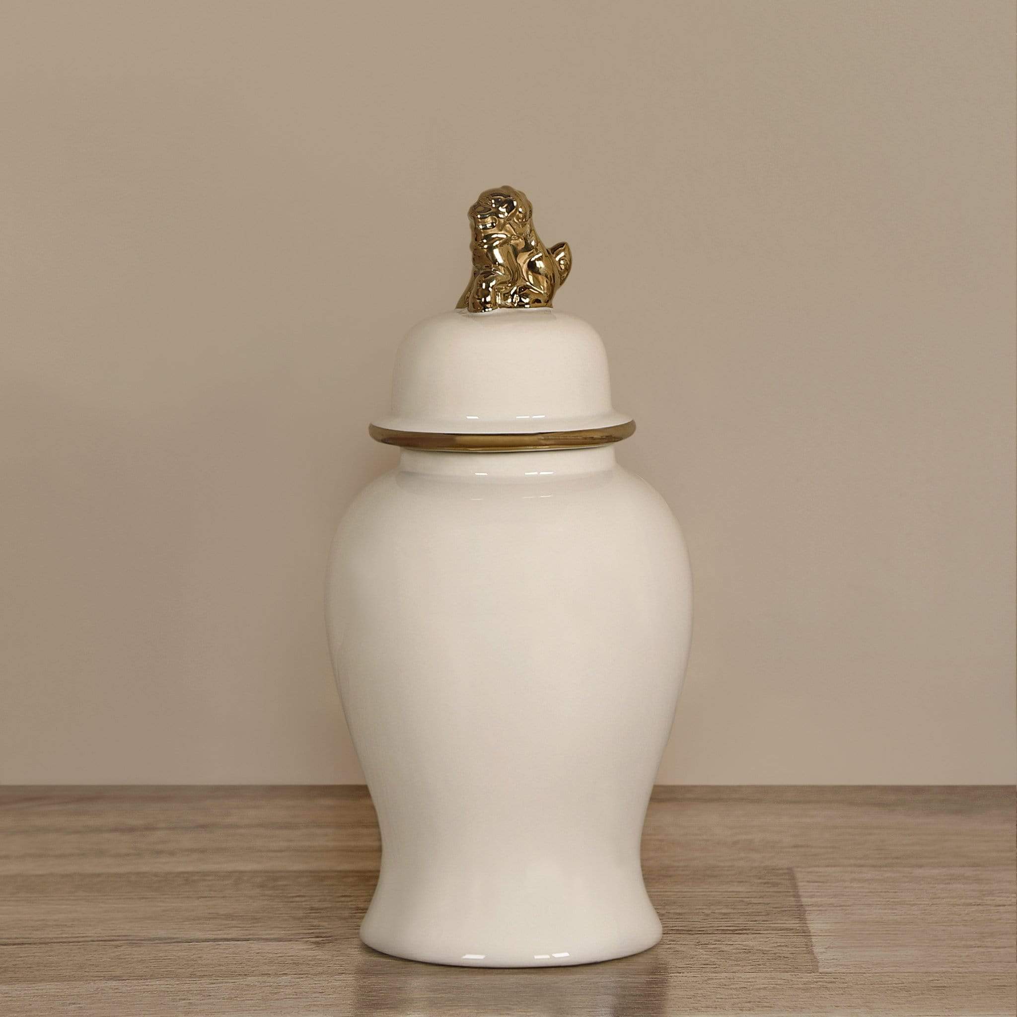 The classic ginger jar style is reimagined with a monochromatic matte white finish. Sometimes, simple pieces make the biggest statement. This beautiful jar features gold details, a stylish silhouette, and a removable lid for effortless storage.