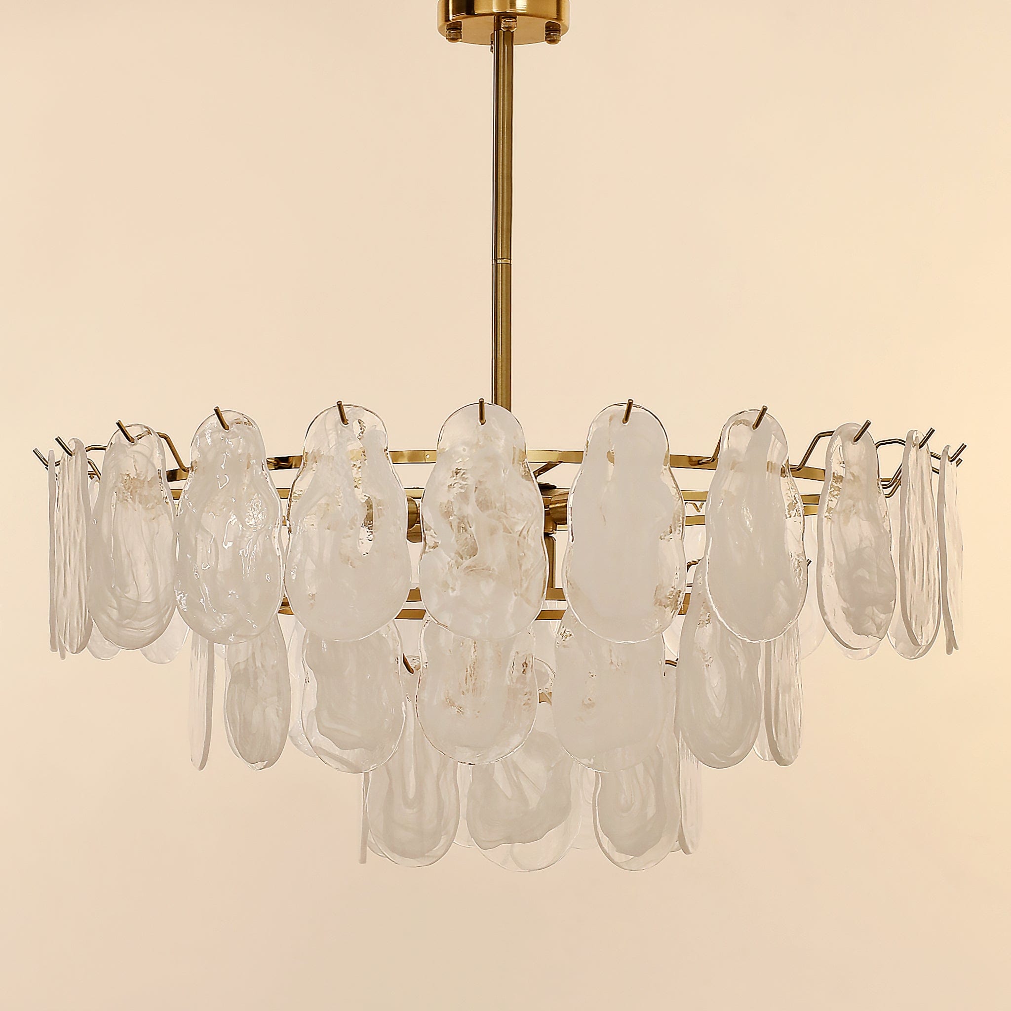 Drawing inspiration from the timeless mid-century modern aesthetic, this graceful chandelier is an essential addition to any meticulously designed environment. It showcases transparent glass discs that beautifully scatter and refract light, complemented by a lustrous gold finish to add an extra layer of sophistication.