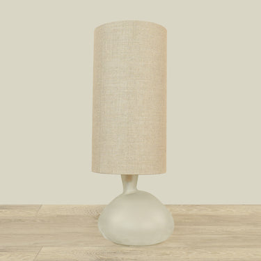 Crafted from pristine white glass and finished with natural linen accents, it seamlessly blends texture and light to create a warm, inviting atmosphere.
