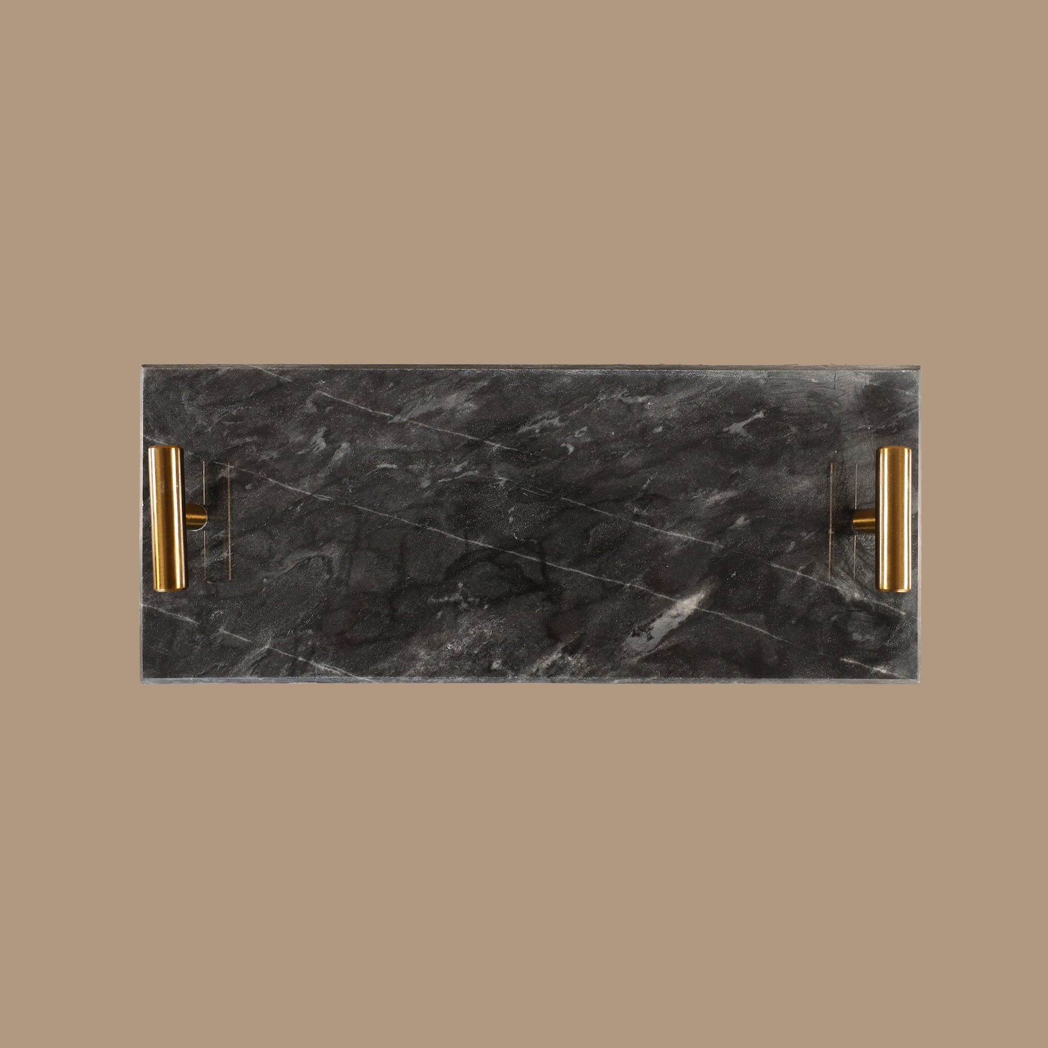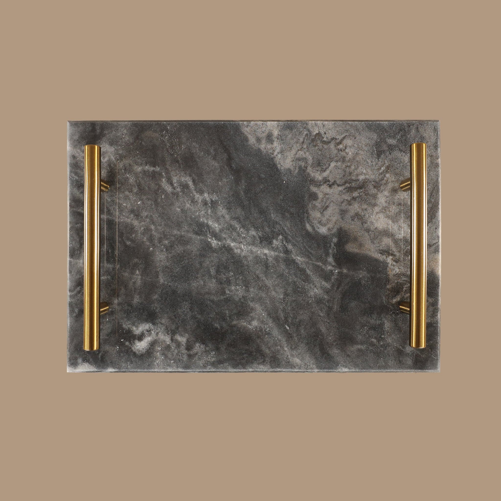 Serve delicious appetizers or desserts on this sleek Marble Tray. The beautifully veined marble tray is highlighted by shining brass for a classic touch. Easily portable by the sturdy handles, this tray could also be used to hold floral arrangements, bath accessories, and many other items to showcase their beauty and elevate your style.