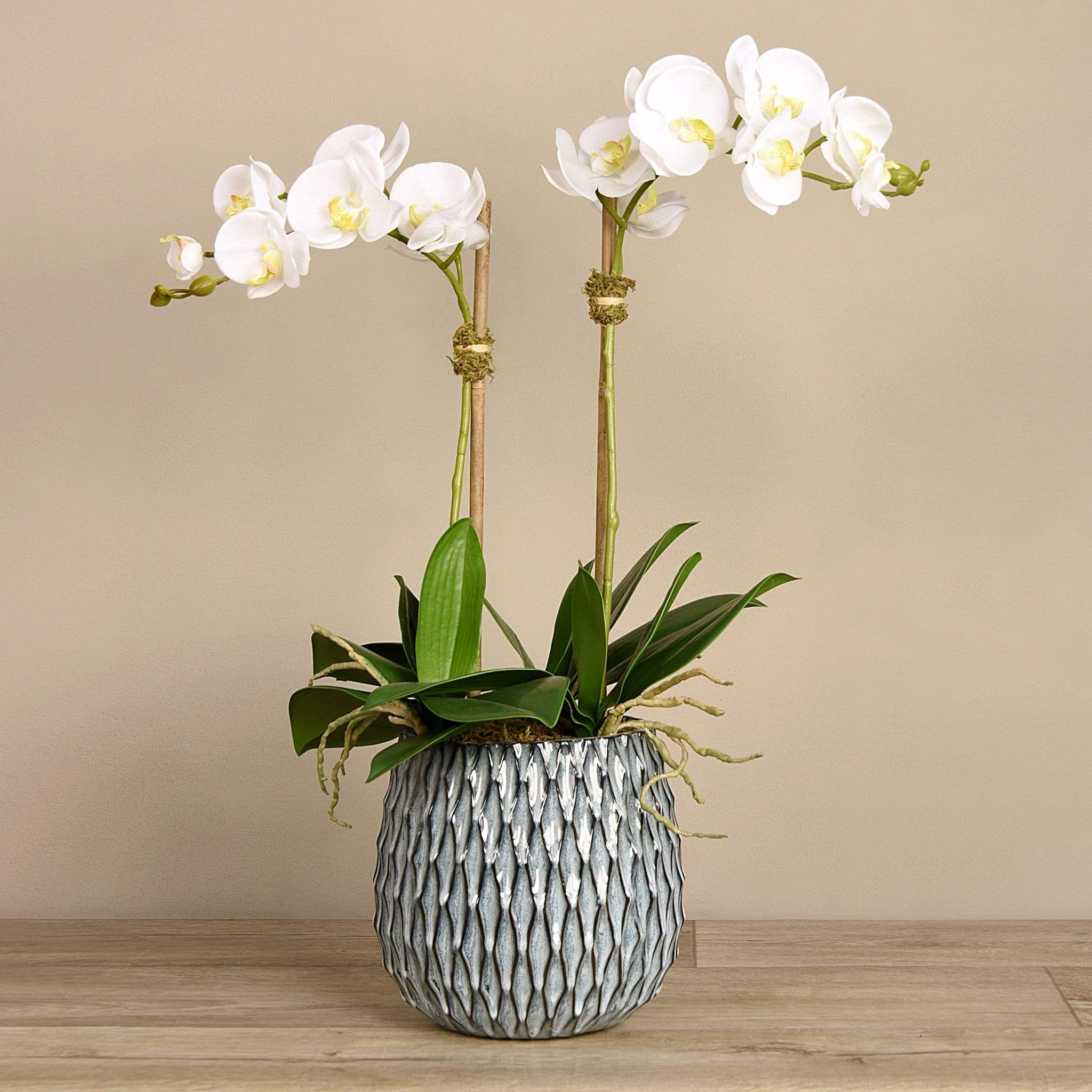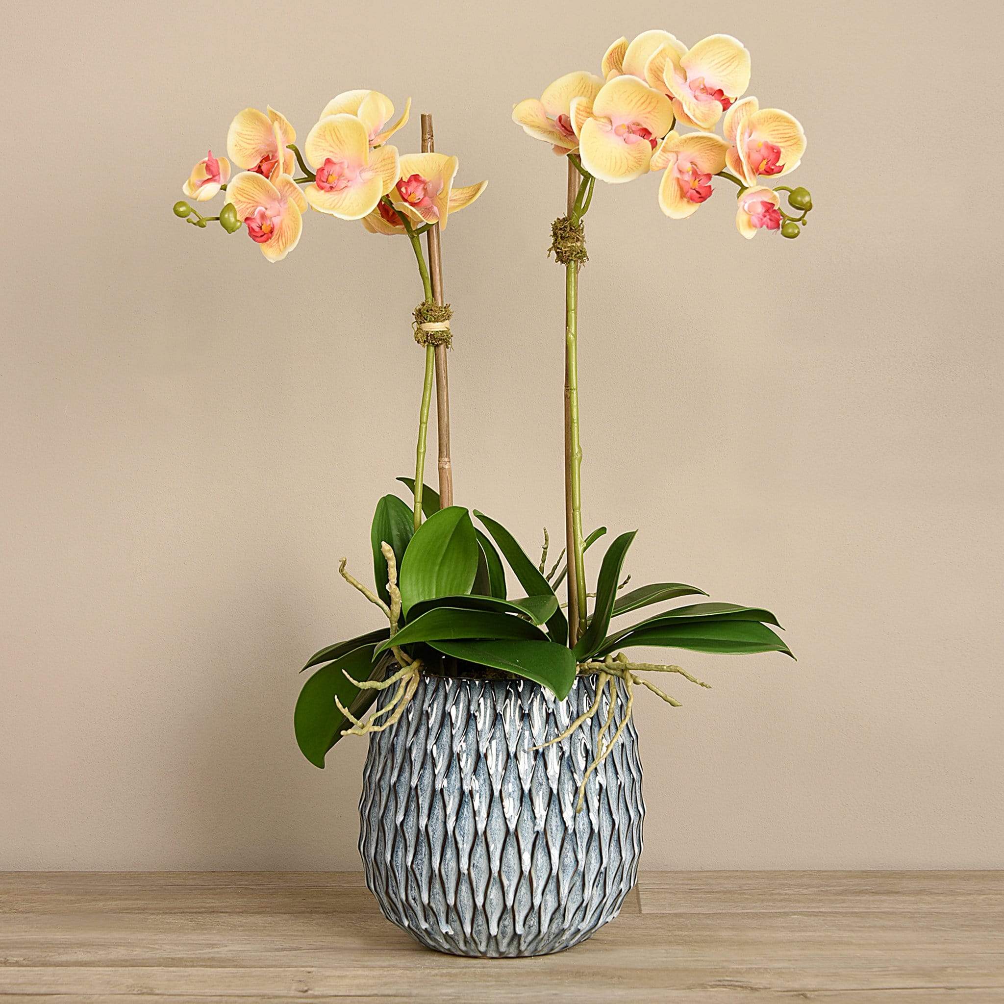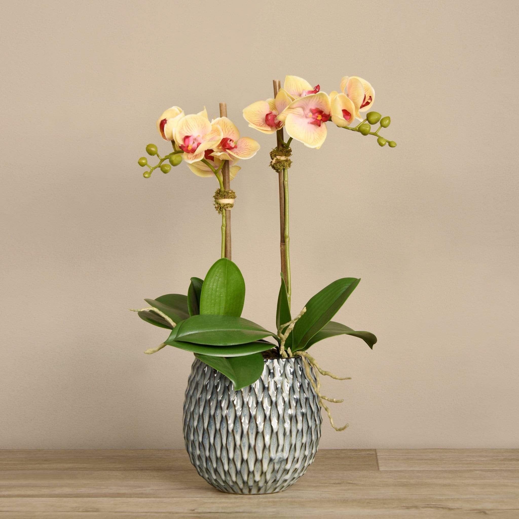 Add taste and texture to your home with this stunning orchid arrangement. Handmade by expert florists using real-touch technology, these faux orchids look and feel astonishingly lifelike. Their textured blue-grey pot beautifully complements them.
