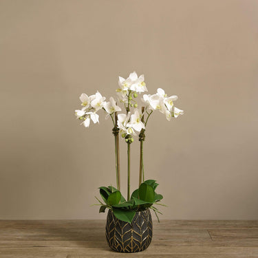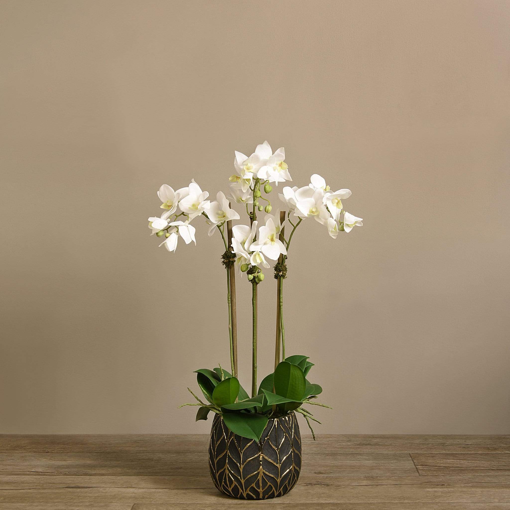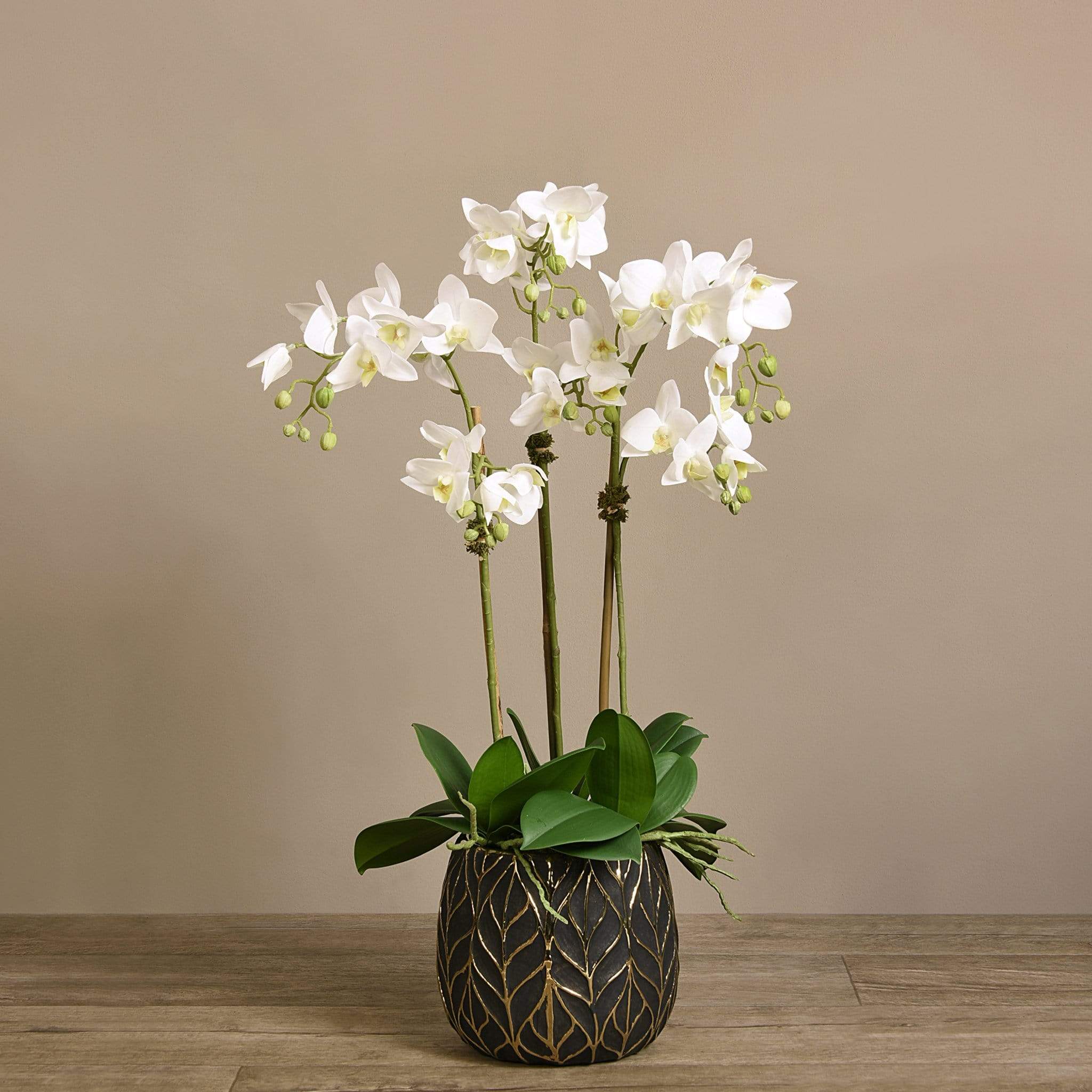 Add long-lasting life to your home with these pretty orchids. Handmade by expert florists with real-touch technology, these orchids look and feel completely lifelike. Their chic leaf-patterned black and gold pot goes with any decor.