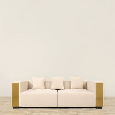 Juelz is all contemporary style and sleek angles; it is the place to relax after a long day. This statement 3-seater sofa features sumptuous velvet fabric and chrome gold stainless steel trim.