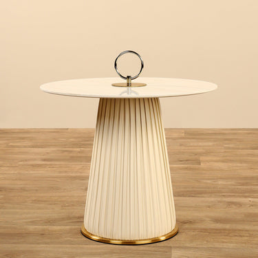 Lend a polished look to seating with a modern table. Designed to coordinate beautifully the Lia tables all feature modern PU leather-covered bases and round tops with chrome gold stainless steel accents.