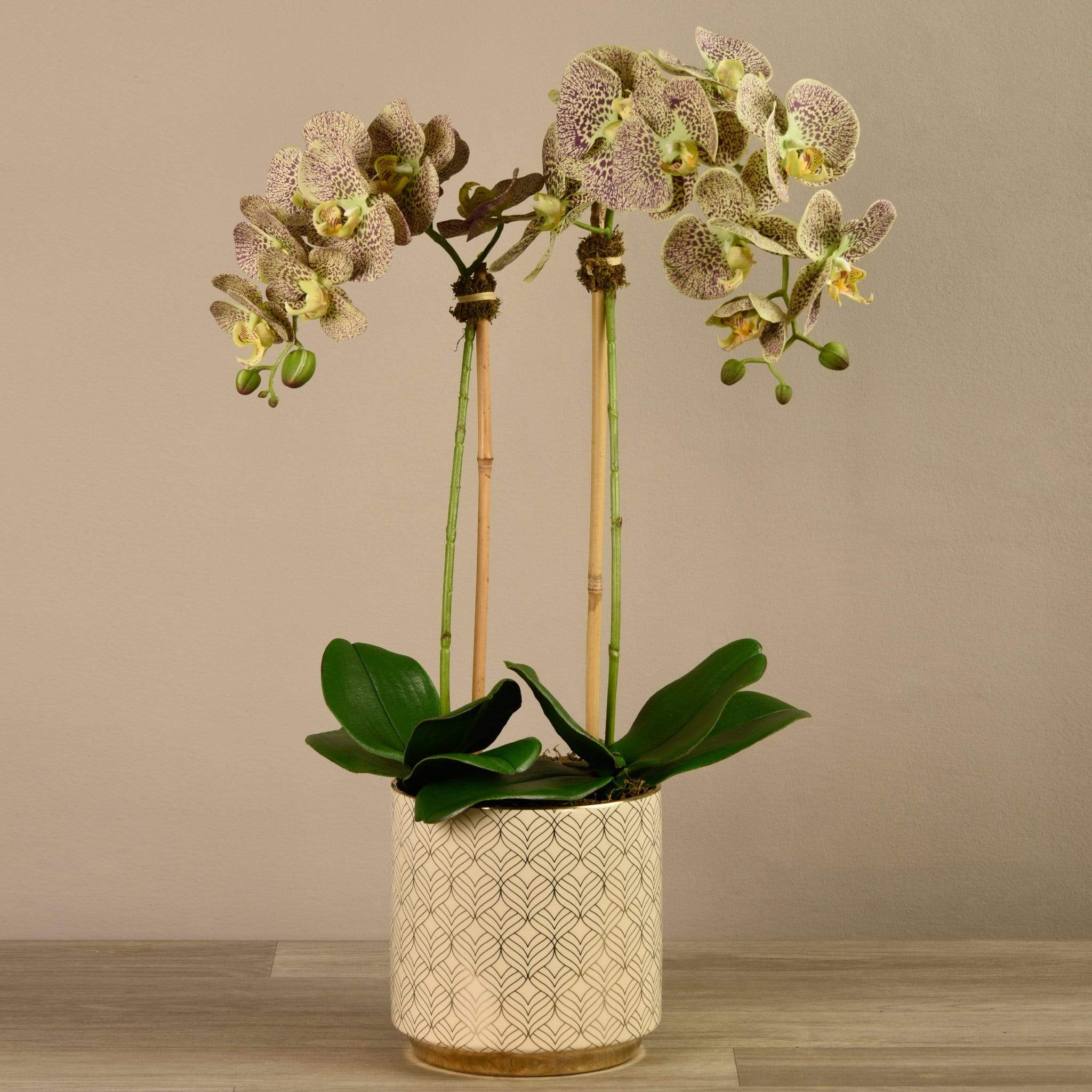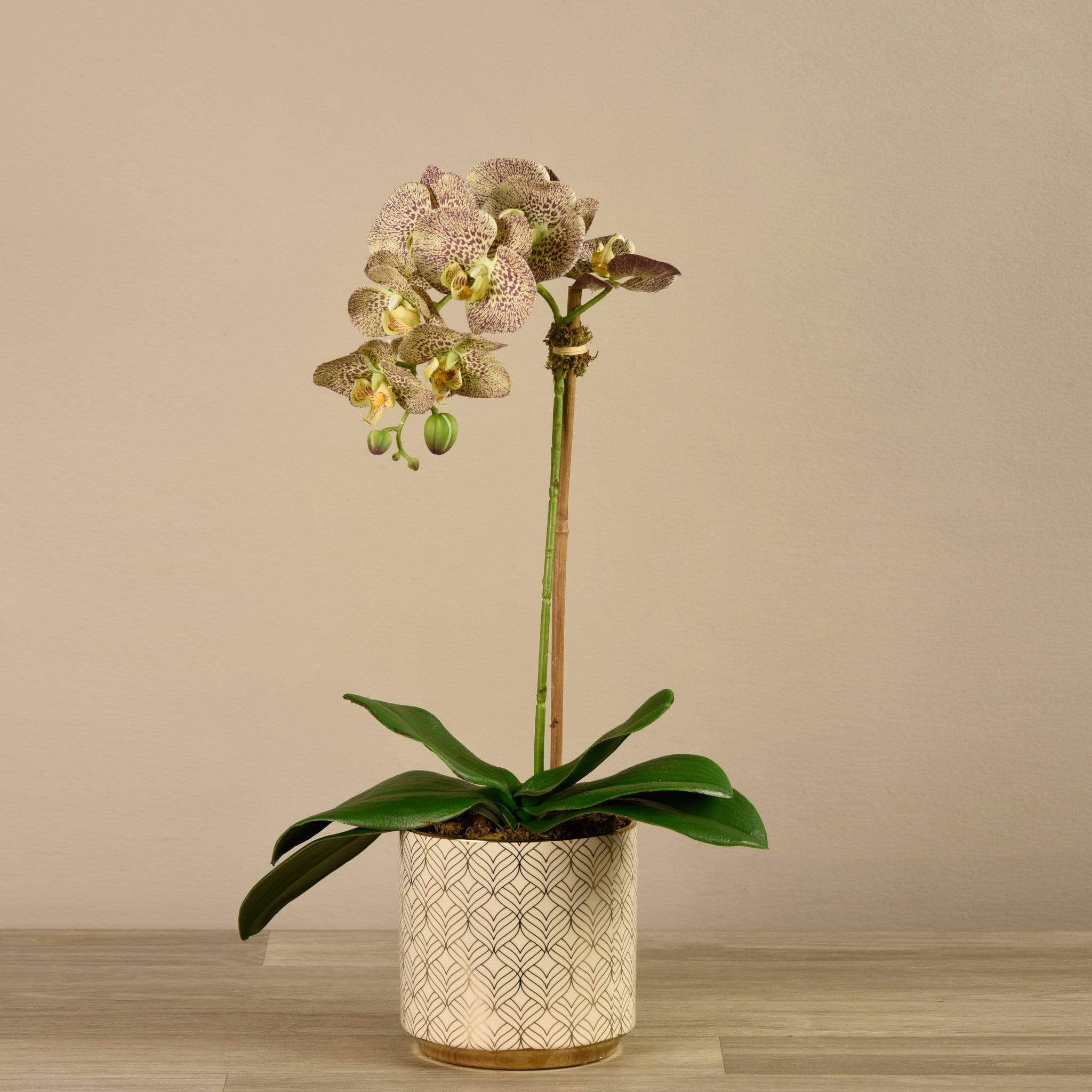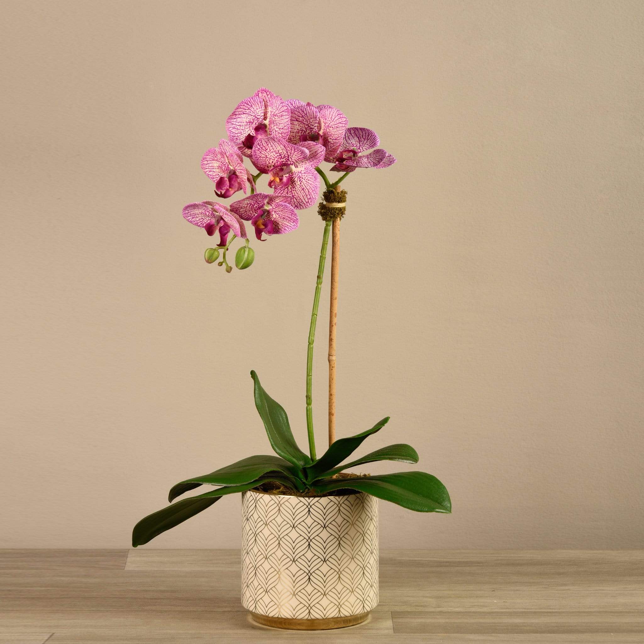 Instantly add a cheery, exotic air to your home. Hand-arranged by our in-house team of florists, this artificial orchid arrangement looks and feels lifelike. Its white and gold patterned pot perfectly complements the vibrant petals.