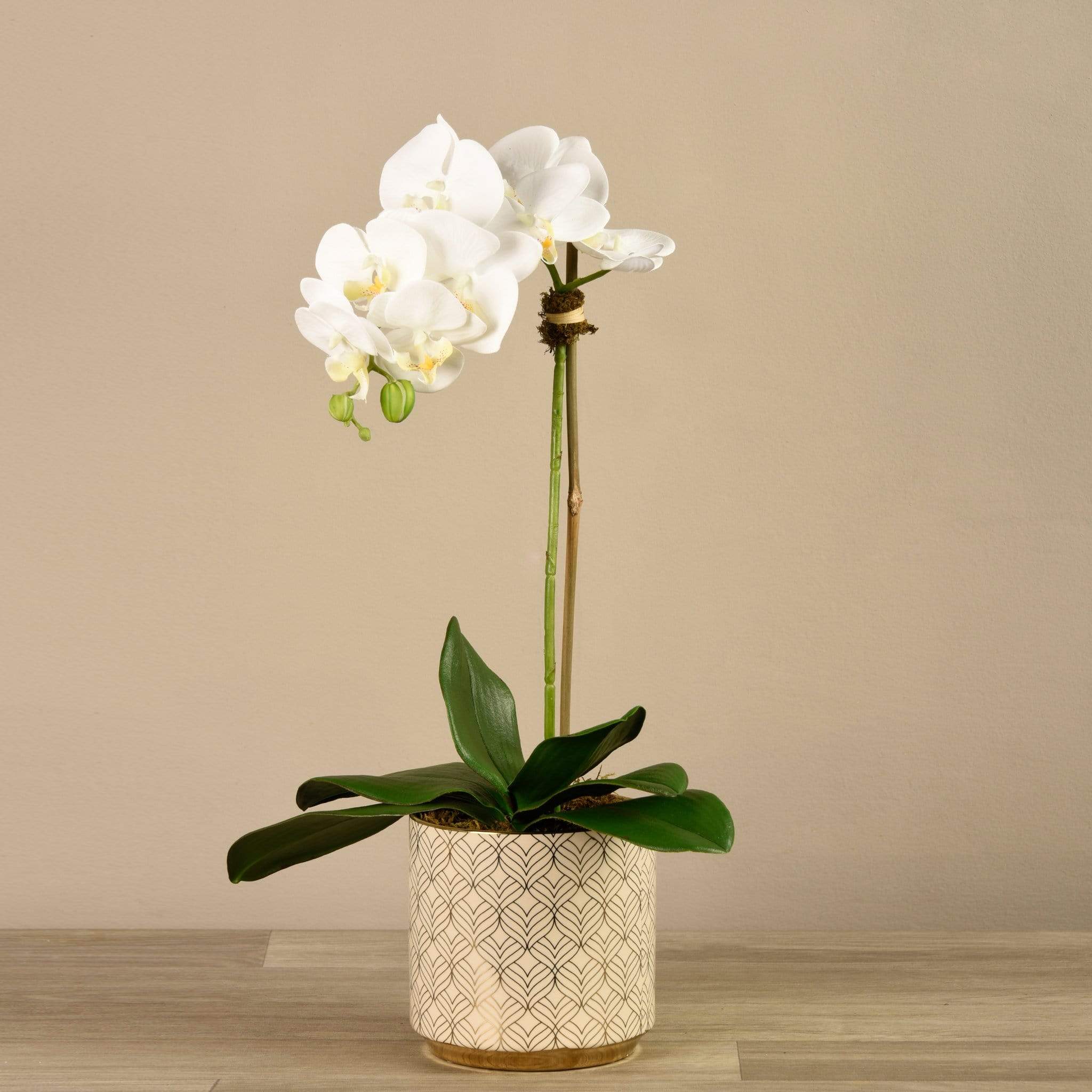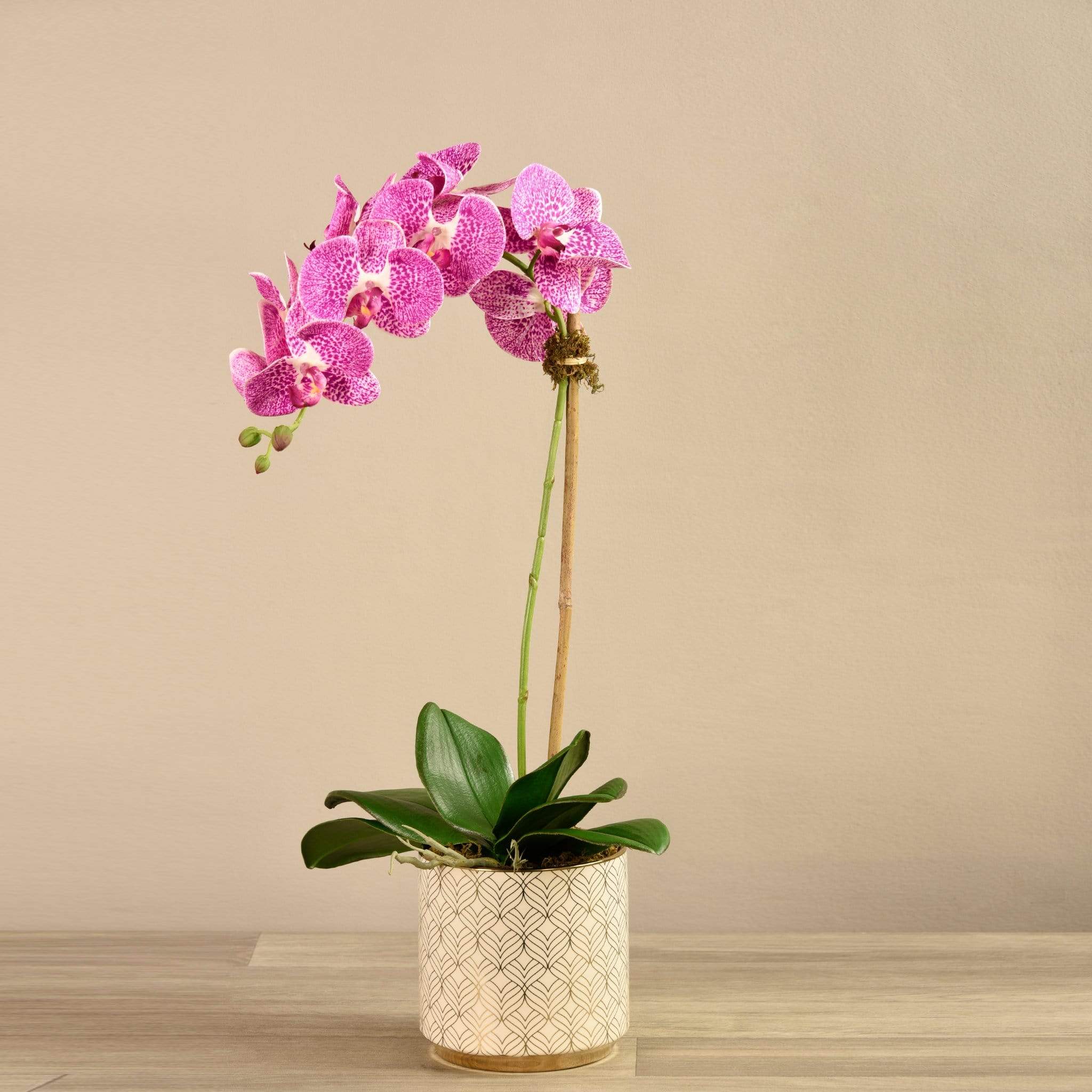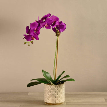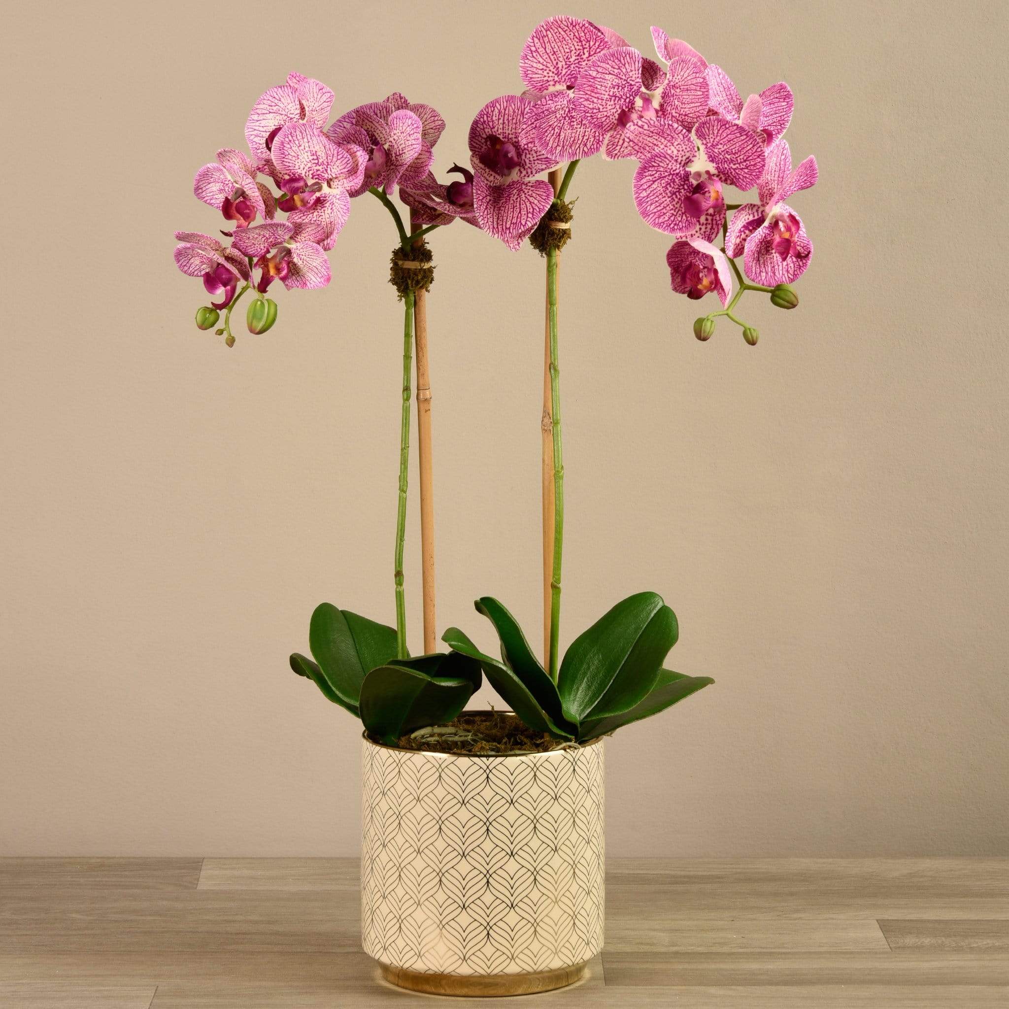 Instantly add a cheery, exotic air to your home. Hand-arranged by our in-house team of florists, this artificial orchid arrangement looks and feels lifelike. Its white and gold patterned pot perfectly complements the vibrant petals.