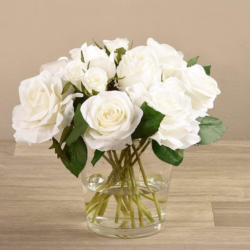 A universal symbol of love and passion, these roses will surely make any living space look more polished. Their silk petals, lush leaves, and green stems look remarkably real set in a delicate glass vase.