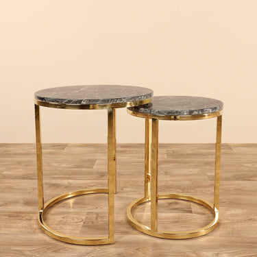 Scaled for functionality and designed for sleek style these nesting coffee tables feature beautiful marble tops. Supported by gleaming chrome gold stainless steel legs they can easily be arranged and rearranged to suit your needs.