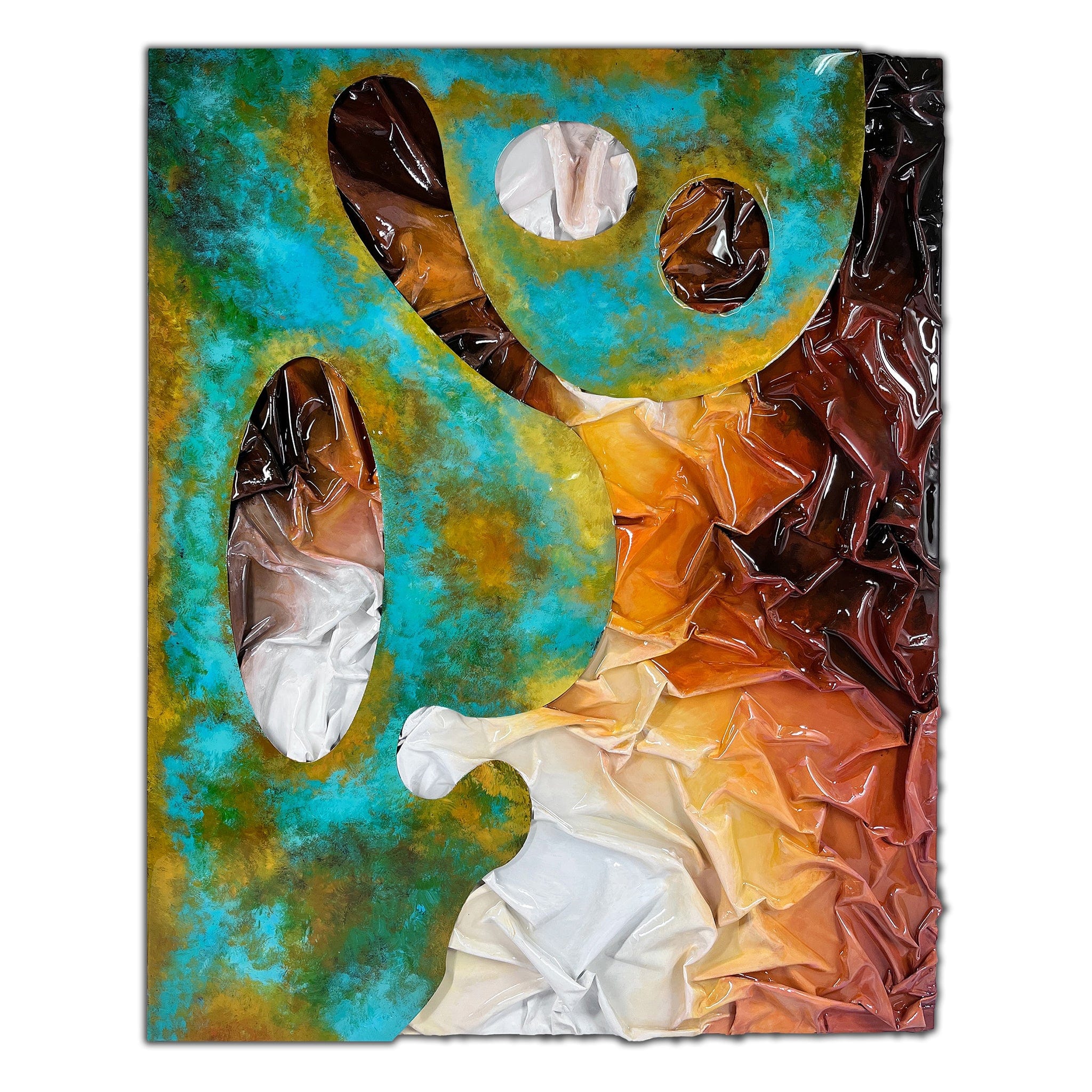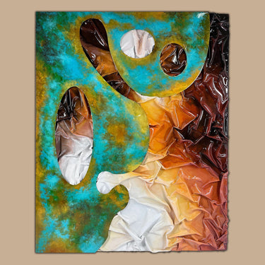 This frameless modern painting is a delight, employing wood coloring and raising techniques for a remarkable tactile experience. The silver flake bottom adds a touch of metallic appeal, while resin glitter infuses the artwork with texture and interest. The result is a harmonious blend of craftsmanship and creativity, inviting the viewer to explore the dynamic interplay of materials and appreciate the allure of this contemporary artwork.