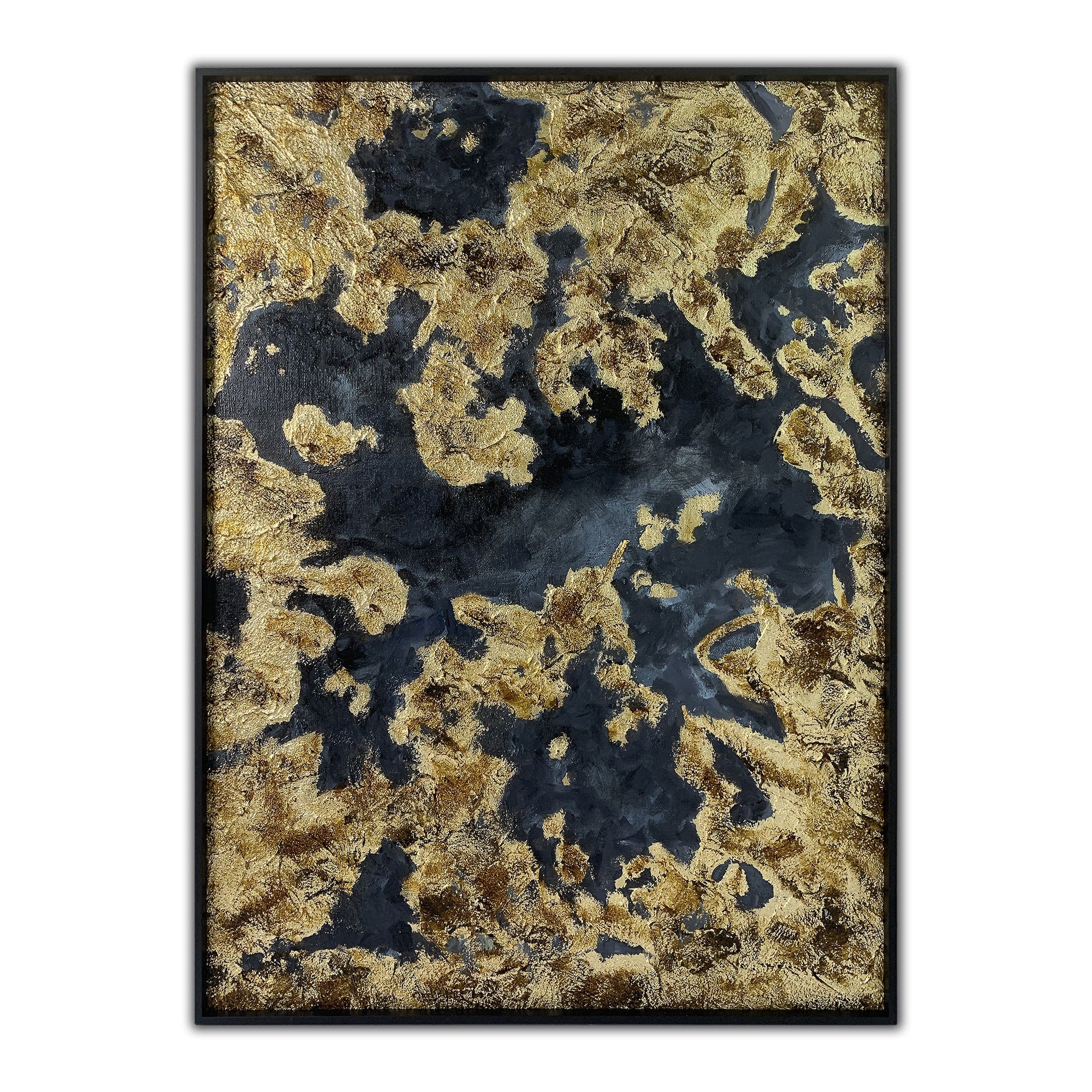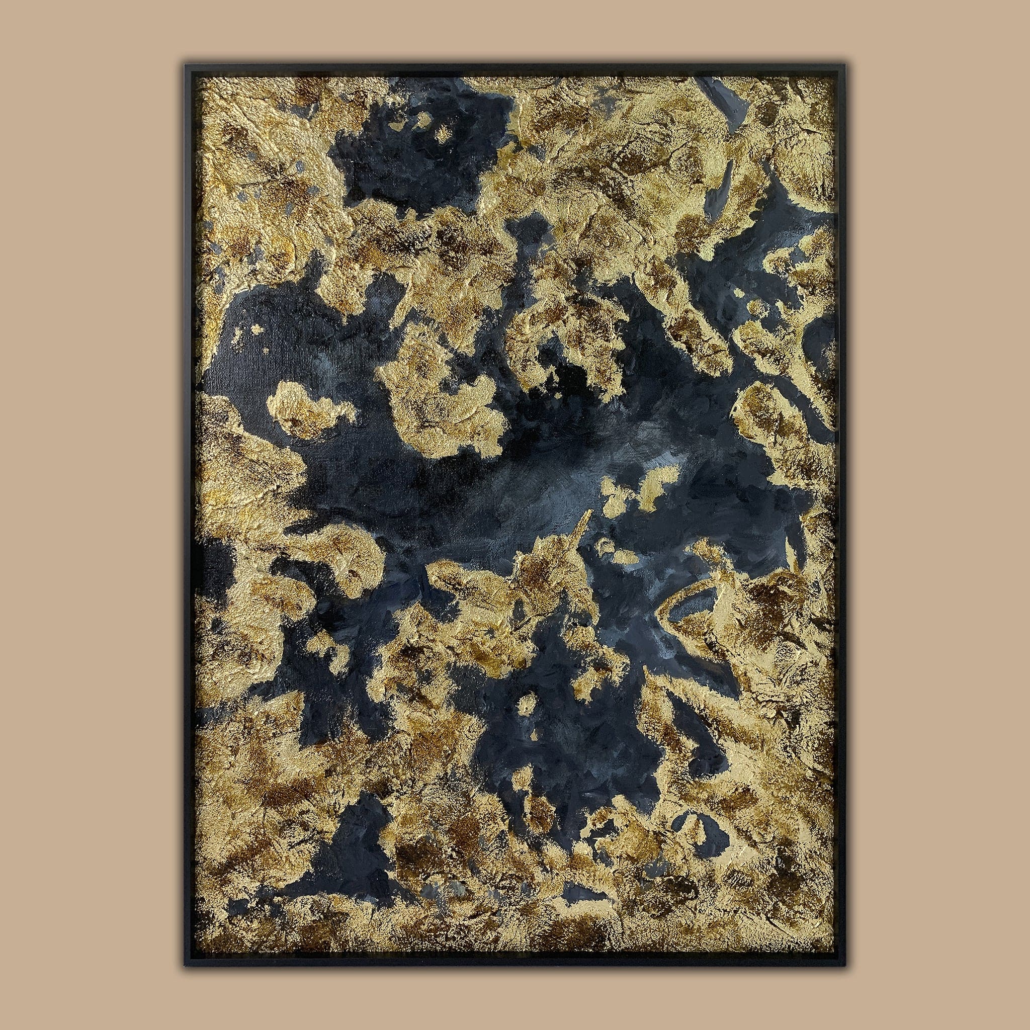Enjoy elegance with this contemporary painting, featuring a scrolling abstract design detailed with luxurious gold foil. The interplay of gold and shades of black evokes a sense of sophistication all encased in a champagne frame for a captivating visual narrative.