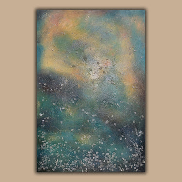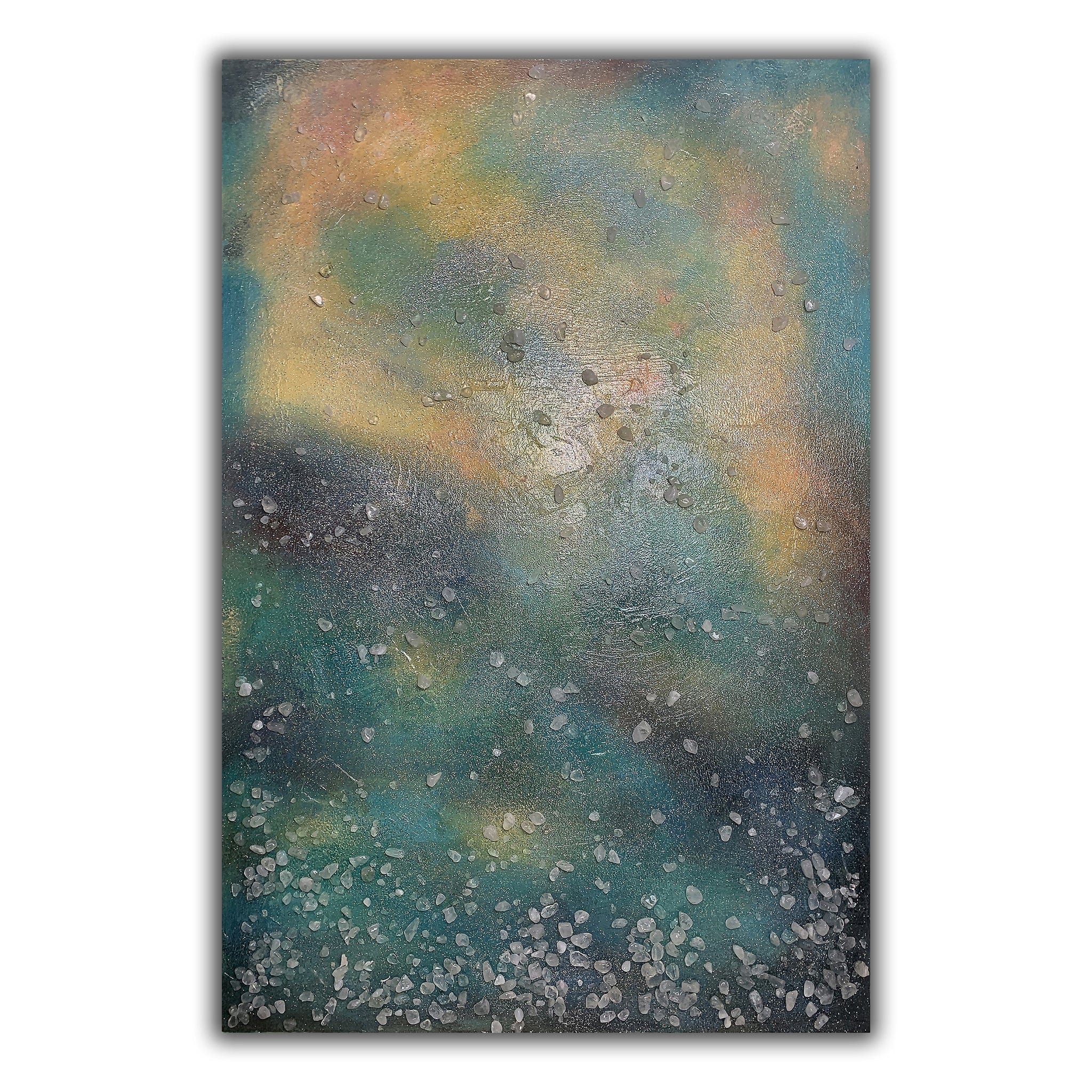 Enjoy elegance with this contemporary painting, featuring a compelling abstract design detailed with a silver foil base, transparent acrylic beads, and resin glitter. The interplay of silver and shades of blue evokes a sense of sophistication perfect for elevating the decor in any room of your home.