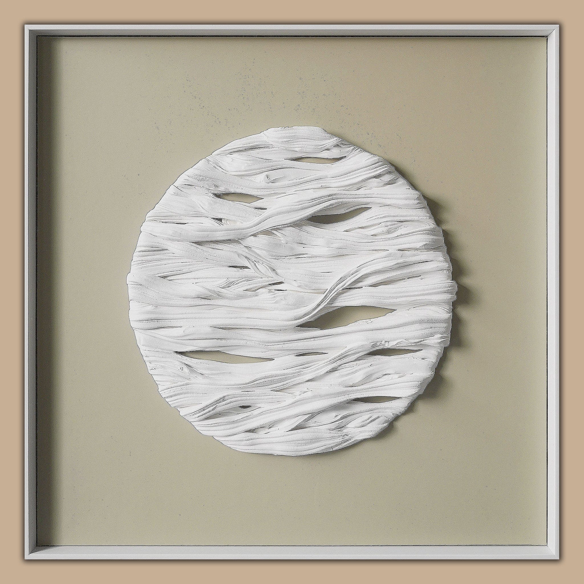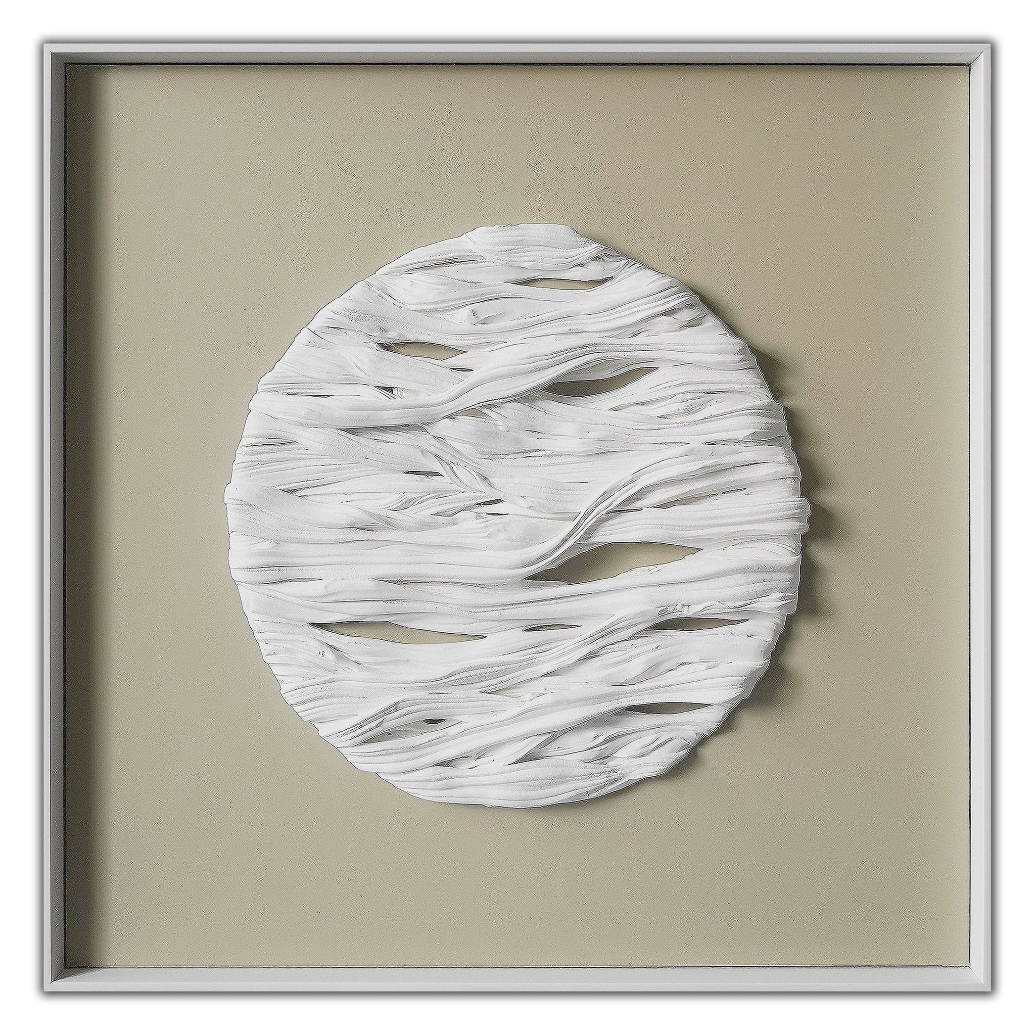 Enhance your aesthetic with this silver framed work of art. The composition is alive with soft clay shaping, acrylic sheeting, and a brushed leather bottom to create a dynamic visual resulting in a contemporary artwork that captivates with its depth and composition.