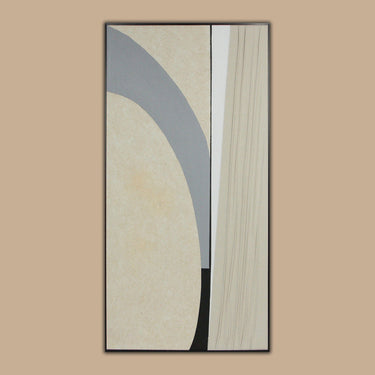 Painted with oil, this abstract artwork is encased in a sleek black frame, providing a sophisticated contrast to the neutral and dark tones within the composition. This beautifully crafted handmade oil painting prominently showcases the contemporary flair and skillful use of form and shape, making it an ideal addition to various decorating styles.