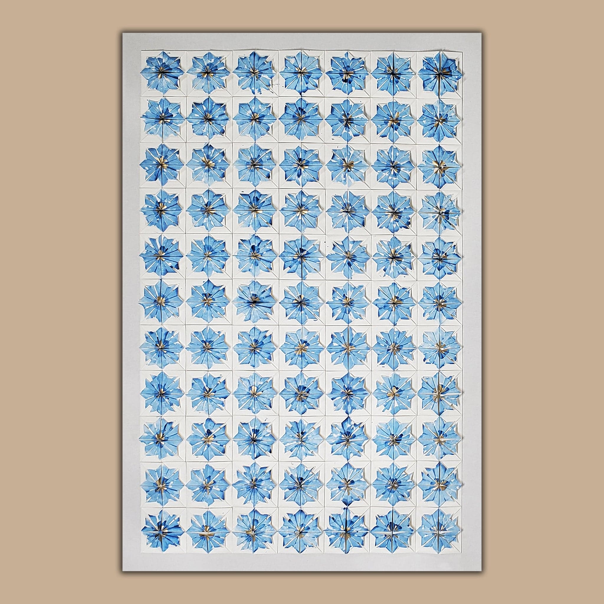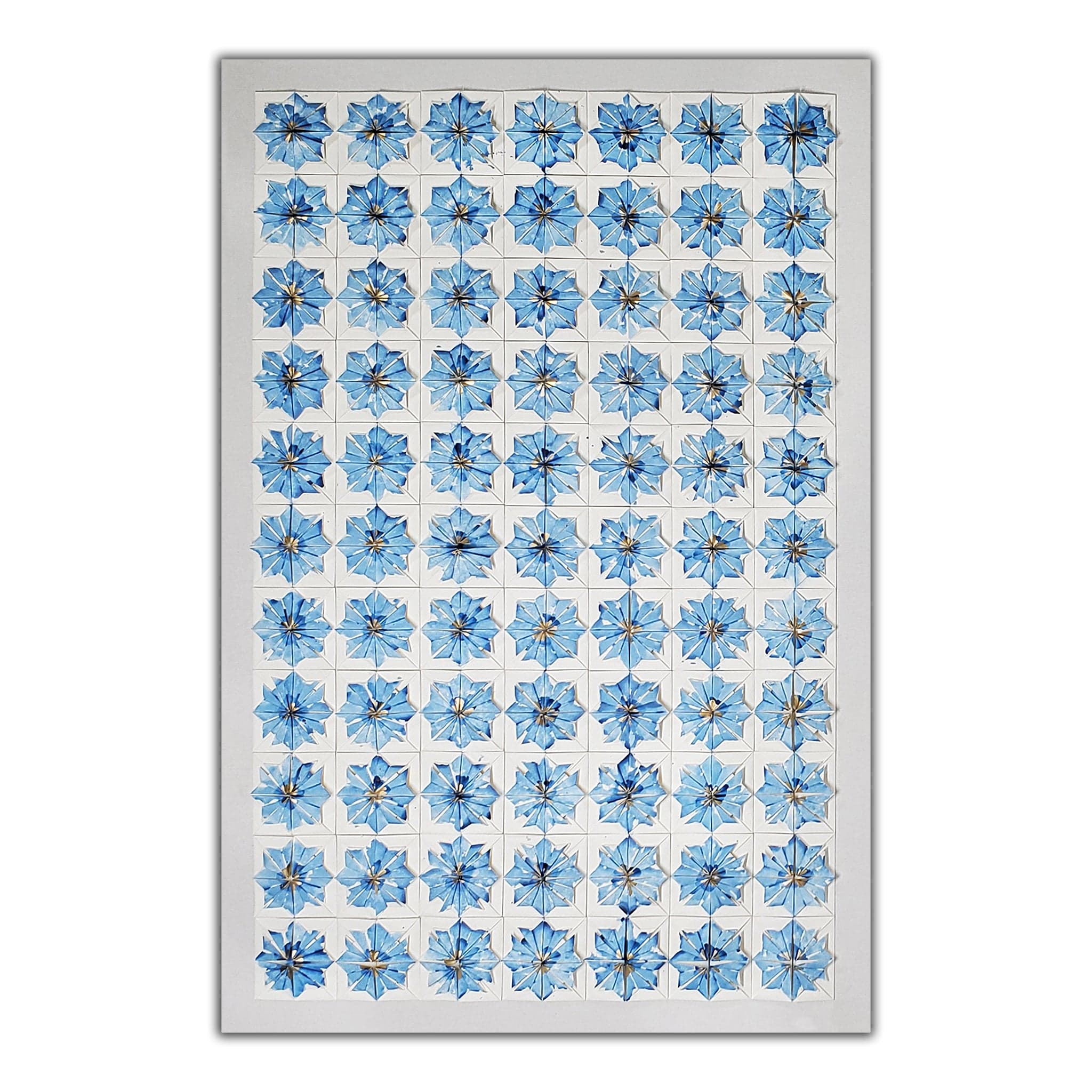 Treat yourself to the captivating beauty of this contemporary acrylic artwork. The canvas comes alive with a display of blue paper and vibrant blue flowers arranged meticulously in a mesmerizing grid-like pattern framed in an acrylic box. Each bloom captures the essence of nature in a modern and visually striking composition.