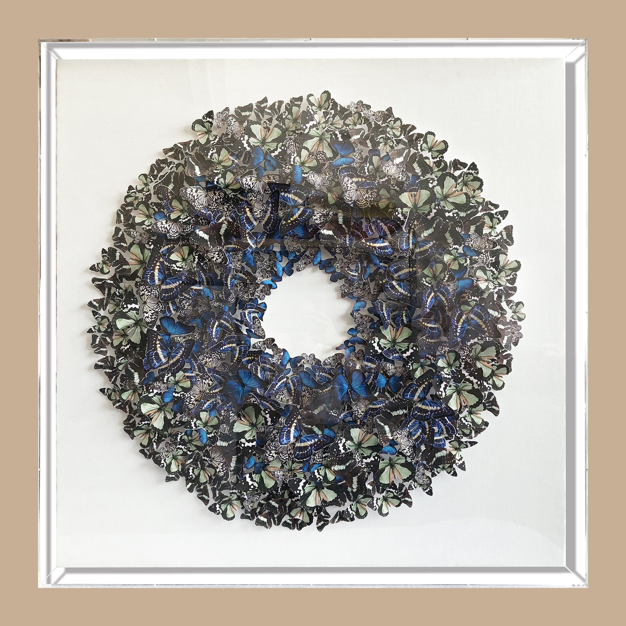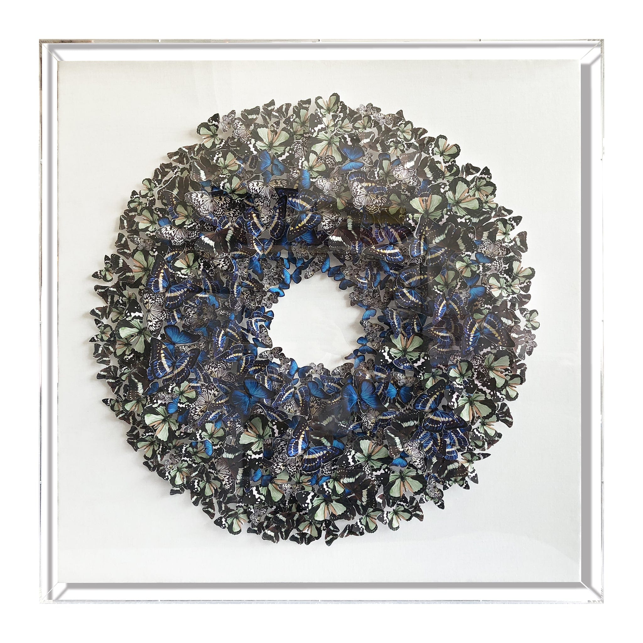 Discover a captivating fusion of artistic expression with our modern mixed media paper butterfly artwork elegantly framed in an acrylic box. This work seamlessly blends mediums to create a dynamic visual that expands traditional boundaries. The mix of exquisitely made paper butterflies and paint creates a unified yet striking composition, offering a contemporary and thought-provoking addition to any space.