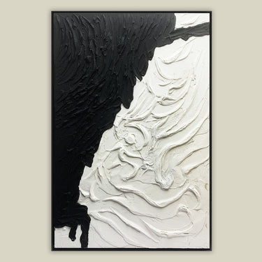 The tactile allure of this contemporary masterpiece lies in the texture that takes center stage. Composed in a captivating black and white palette, the artwork, framed in sleek black, transcends boundaries. The interplay of shadows and highlights, coupled with the tactile elements, creates a visually arresting experience perfect for a statement on any wall.