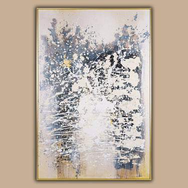 Painted with oil, this abstract artwork is encased in a sleek champagne frame, providing a sophisticated contrast to the neutral tones within the composition. This beautifully crafted handmade oil painting prominently showcases the contemporary flair and skillful use of form and shape, making it an ideal addition to various decorating styles.