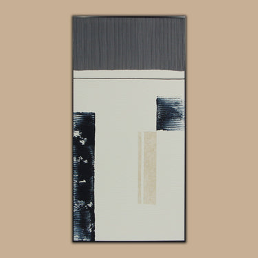 Painted with oil, this abstract artwork is encased in a sleek black frame, providing a sophisticated contrast to the neutral and dark tones within the composition. This beautifully crafted handmade oil painting prominently showcases the contemporary flair and skillful use of form and shape, making it an ideal addition to various decorating styles.