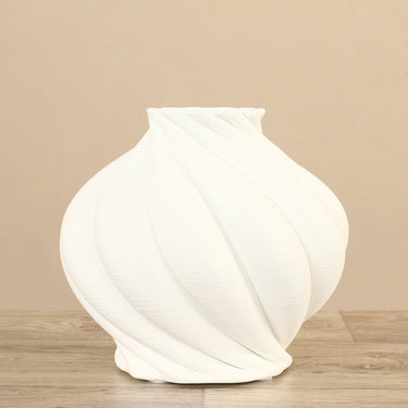 Simplicity and minimalist elegance give this ceramic vase a sleek, modern look. Crafted from ceramic, it features a round design that curves and twists, creating a clean, understated look. This vase is sized to fit neatly onto shelves or tables.