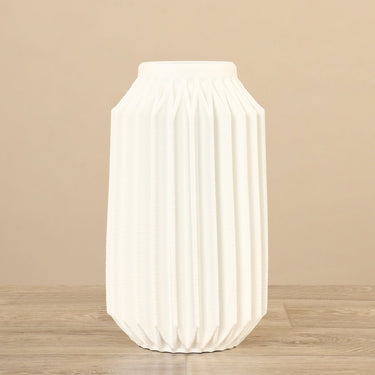 Simplicity and minimalist elegance give this ceramic vase a sleek, modern look. Crafted from ceramic, it features a contemporary ribbed design creating a clean, understated look. This vase is sized to fit neatly onto shelves or tables.