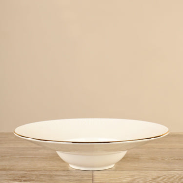 Create a modern tablescape with a deep plate perfect for display or serving. This elegant plate is designed in porcelain and finished in versatile white with gleaming gold trim.