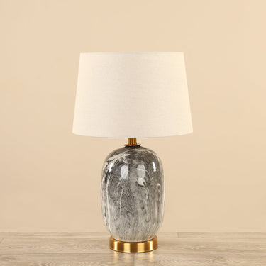 This exquisite table lamp boasts a faux marble finish that radiates sophistication. Constructed from ceramic and adorned with brass-finished accents, it showcases a modern silhouette enhanced by a fabric shade. The resulting illumination is both gentle and dazzling, making it a fitting choice for any space.