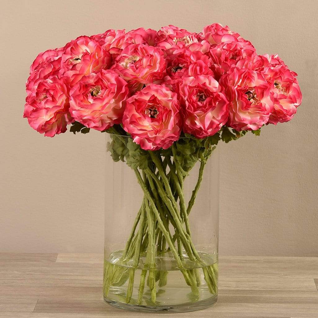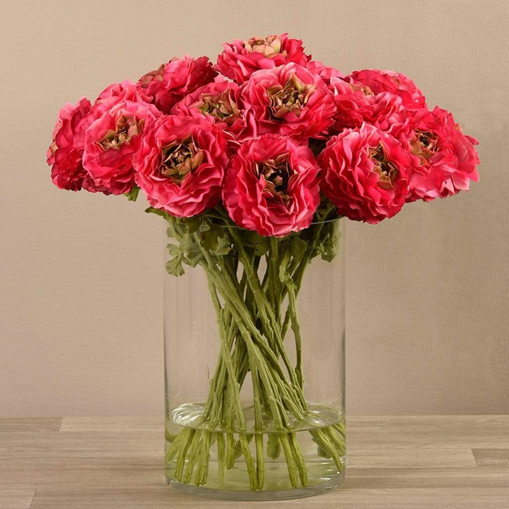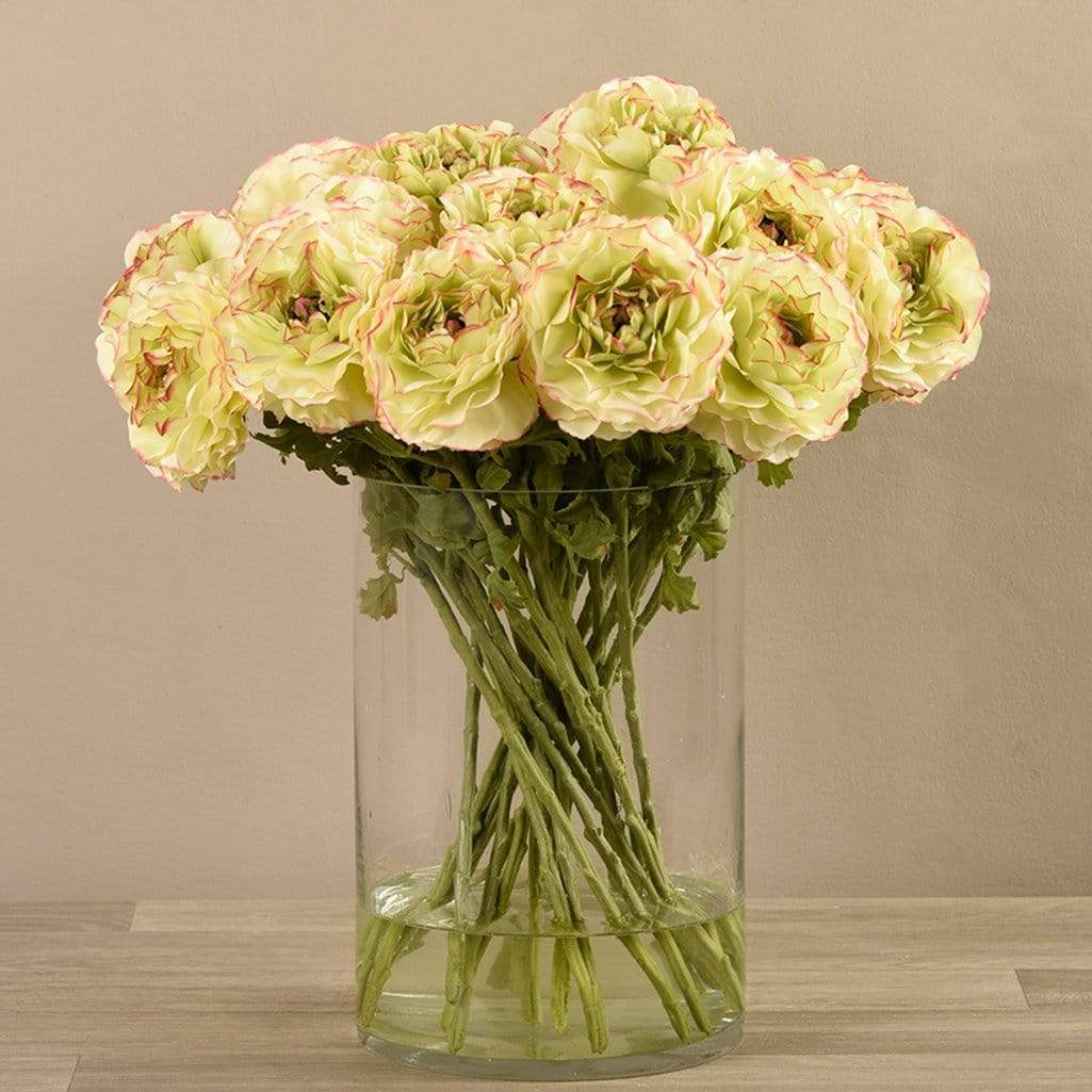 A symbol of charm and attractiveness, this elegant ranunculus arrangement will brighten up any living space. These artificial ranunculus flowers look and feel remarkably real. Their tall glass vase is pretty and timeless, accentuating the long green stems.