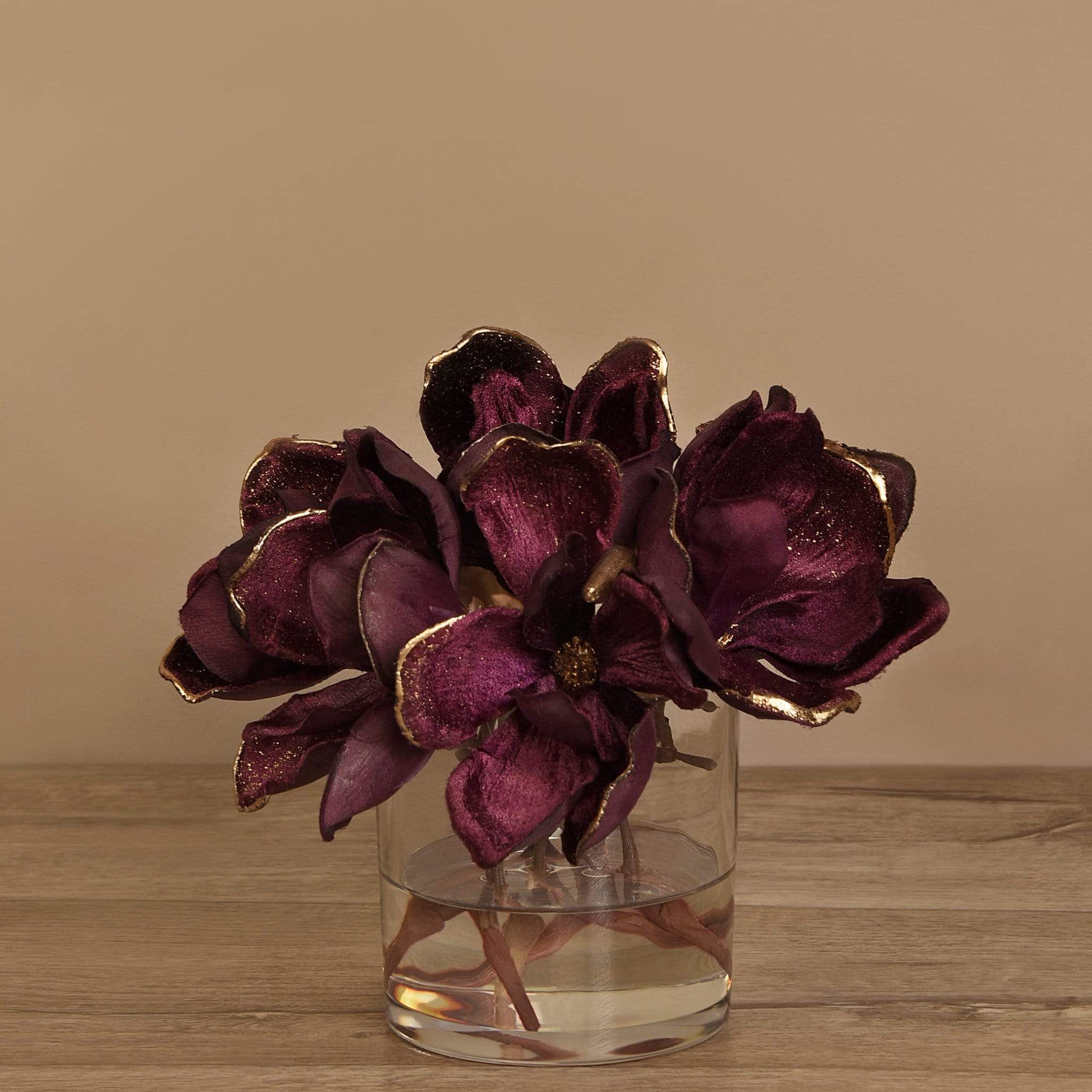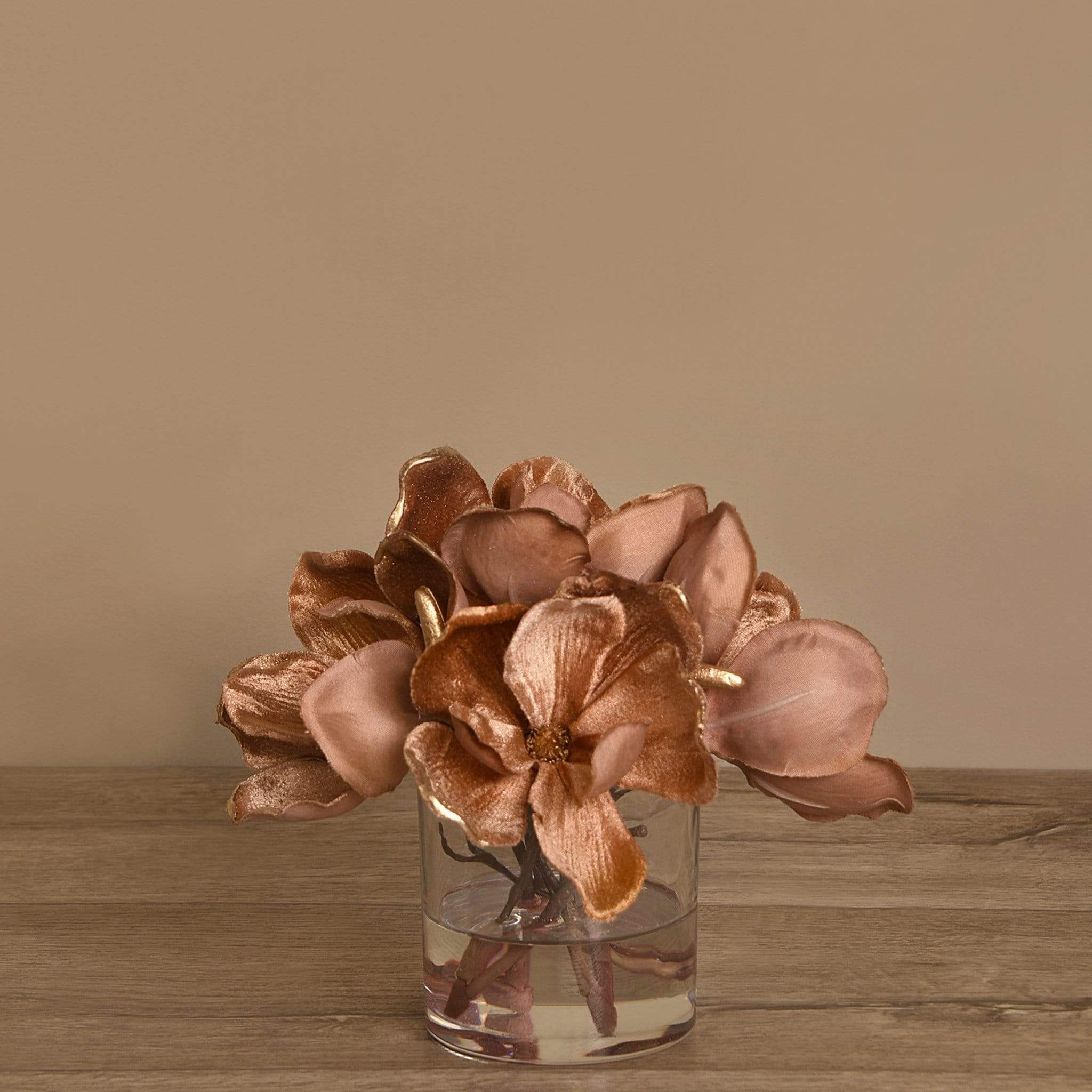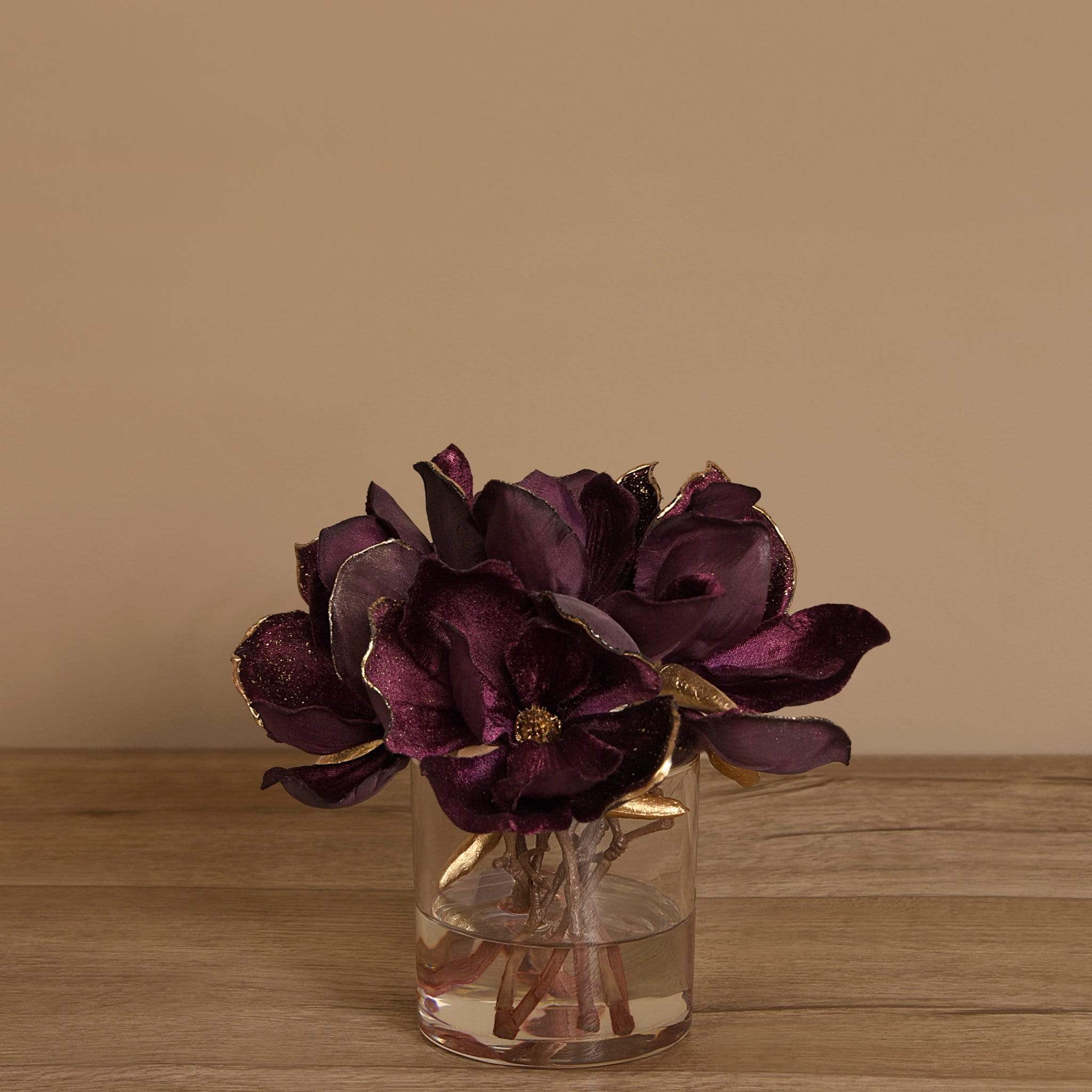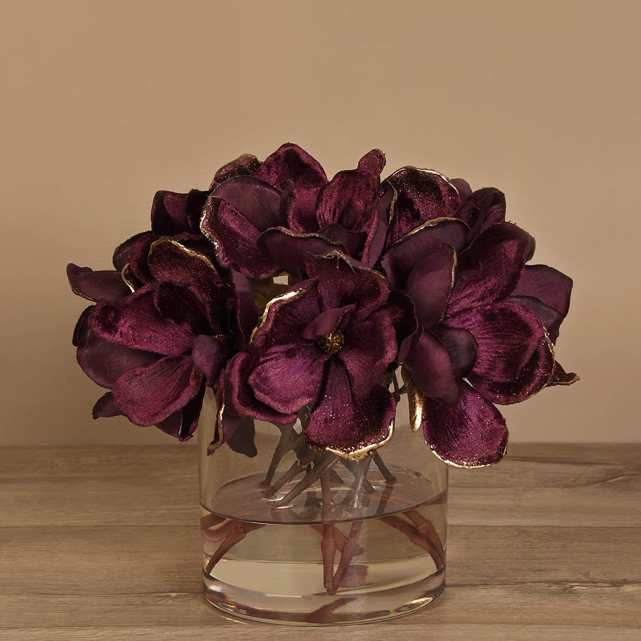 Our Velvet Magnolia in Glass Vase is a lovely floral arrangement that brings timeless elegance to any space. This stunning piece features a single, lush magnolia bloom crafted from velvety fabric, exuding a rich, soft texture and a naturalistic appearance. The magnolia's petals are delicately detailed, capturing the flower’s graceful beauty and subtle charm.