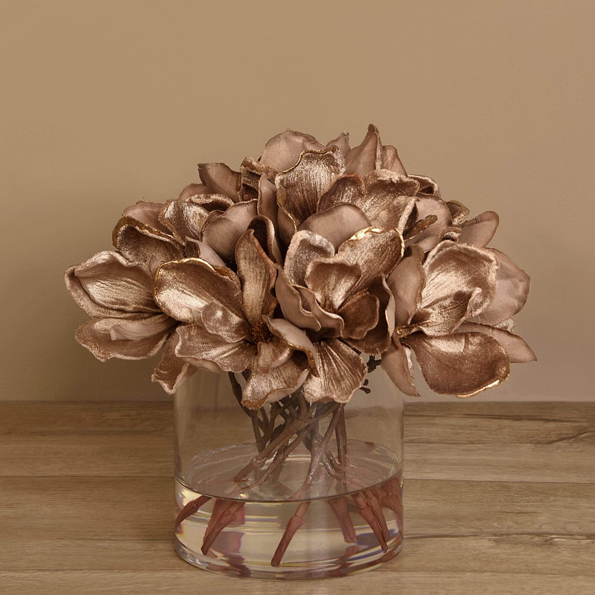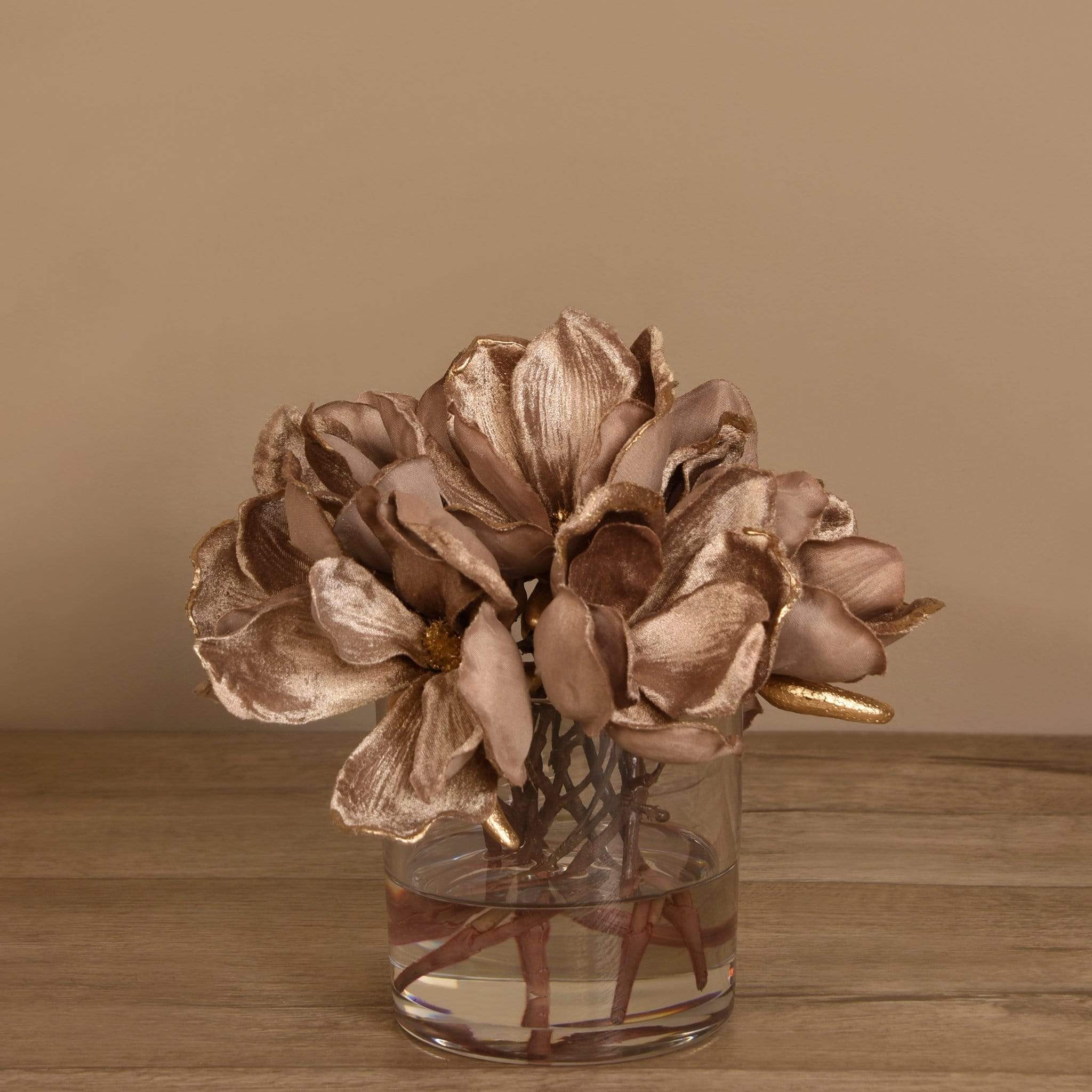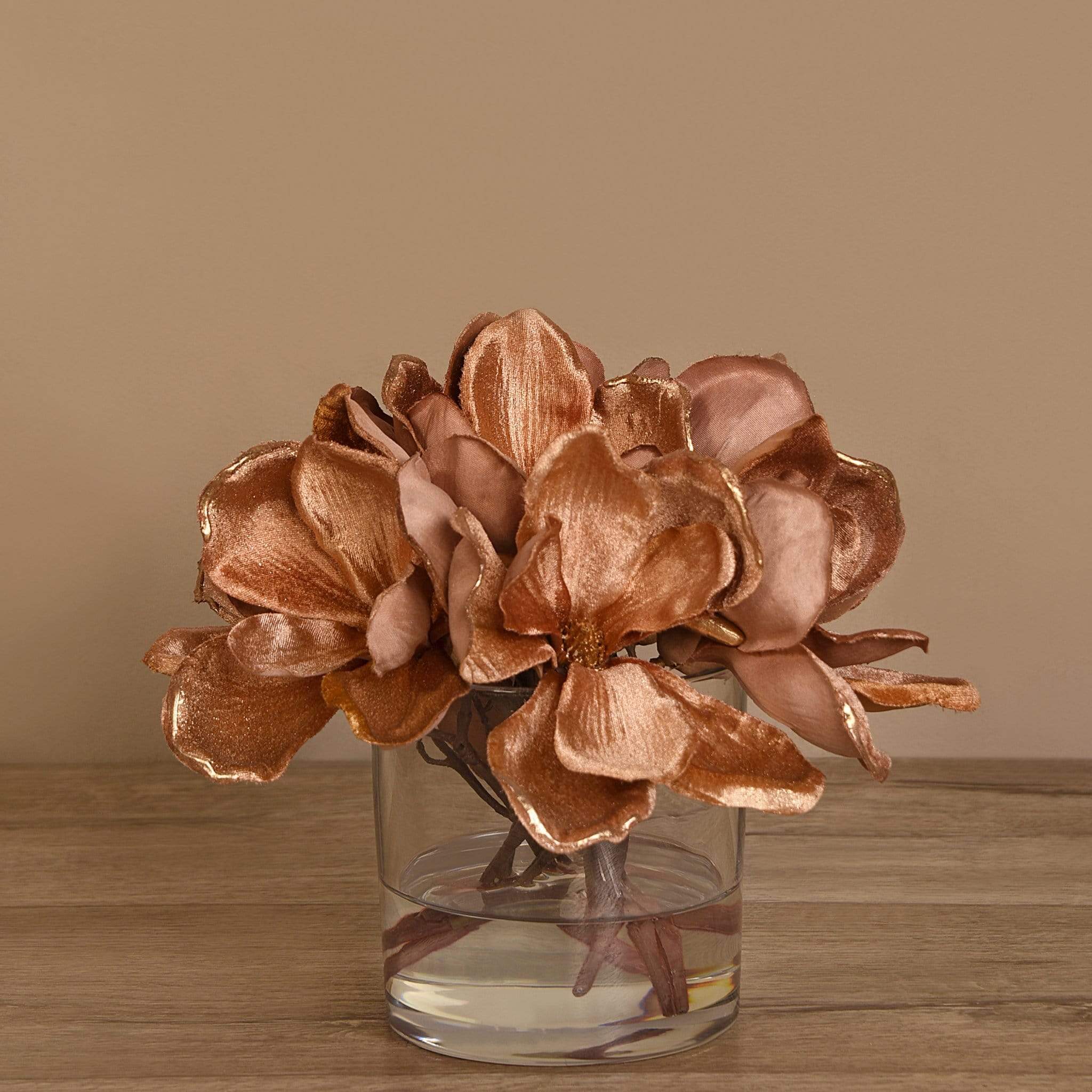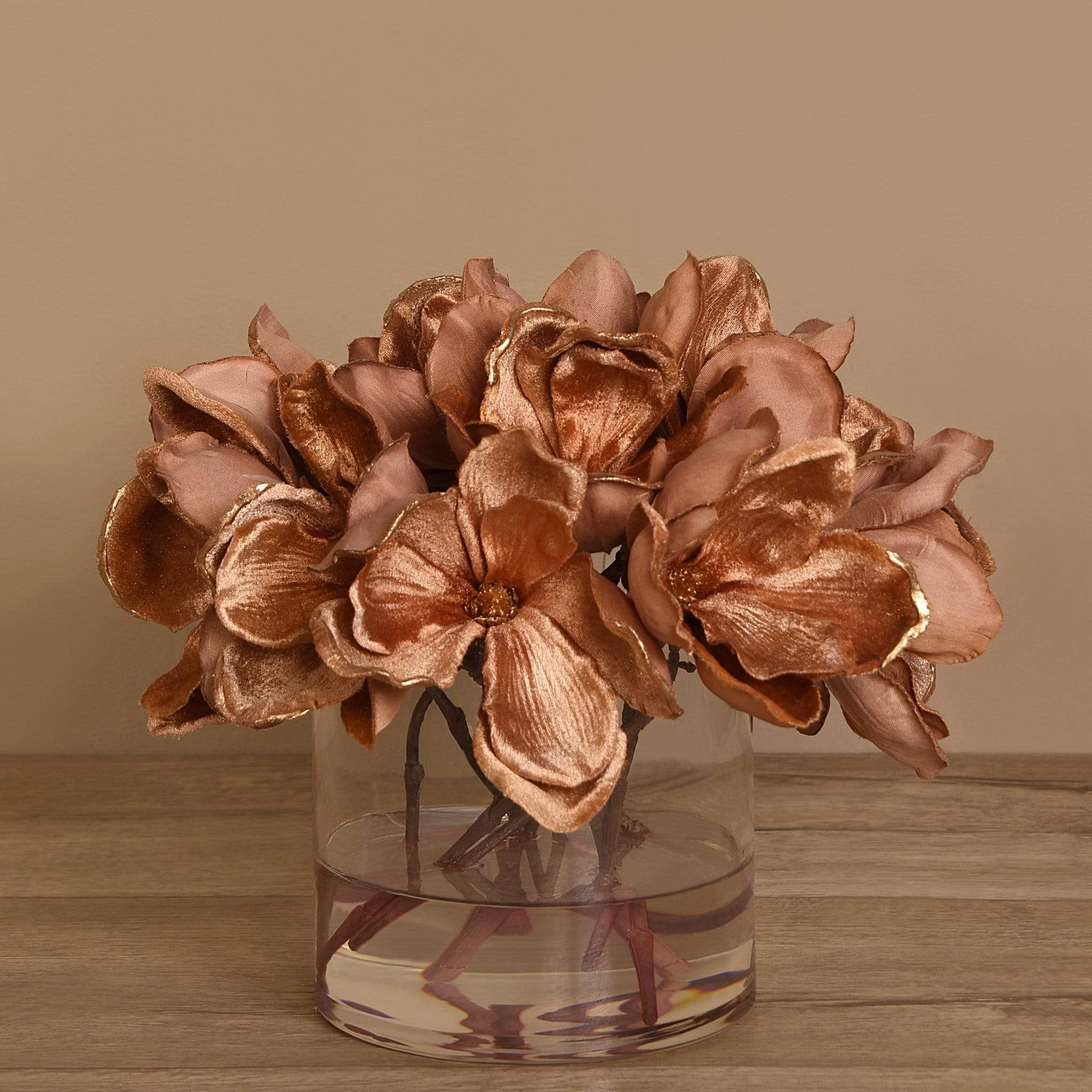 Our Velvet Magnolia in Glass Vase is a lovely floral arrangement that brings timeless elegance to any space. This stunning piece features a single, lush magnolia bloom crafted from velvety fabric, exuding a rich, soft texture and a naturalistic appearance. The magnolia's petals are delicately detailed, capturing the flower’s graceful beauty and subtle charm.