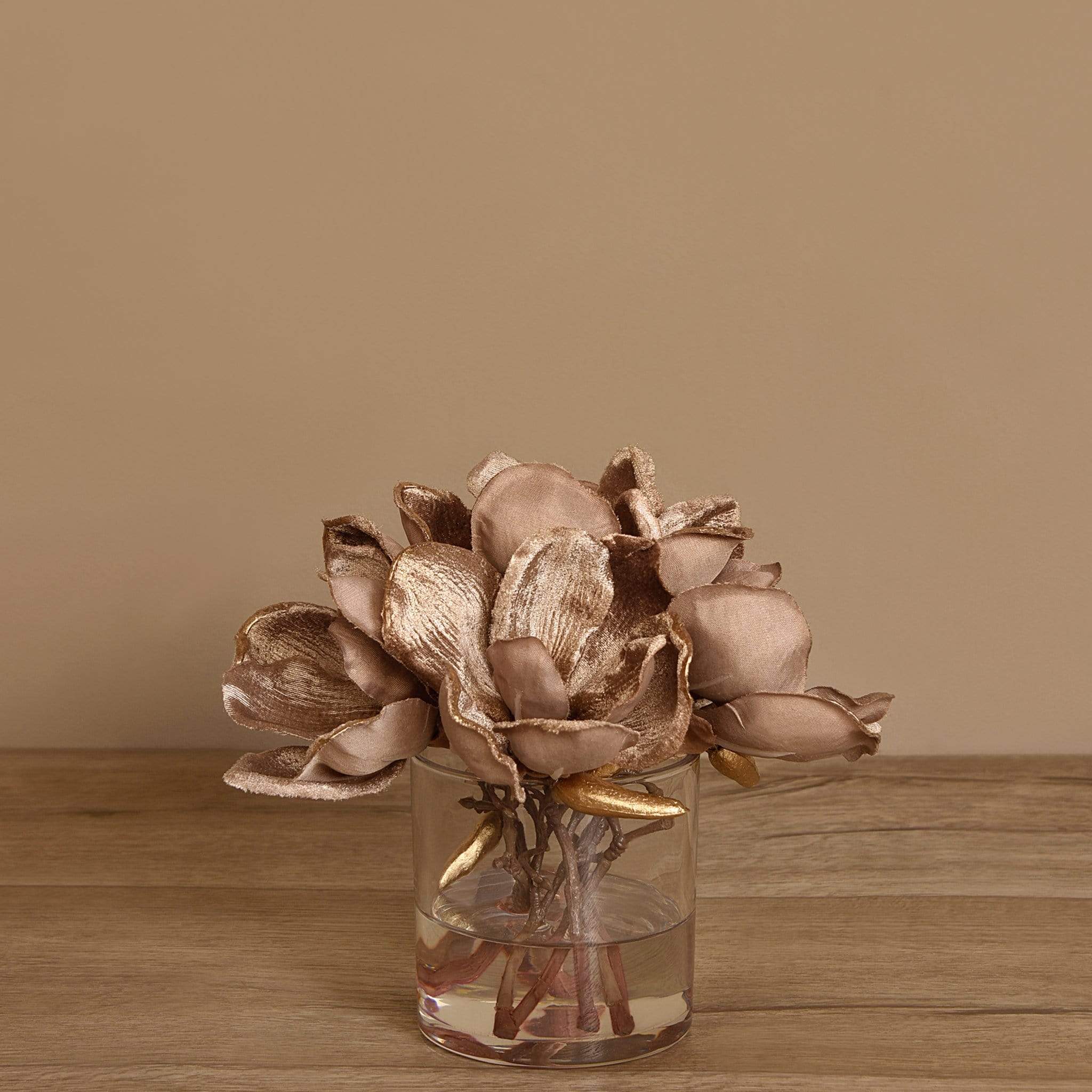 Arranged in a clear, cylindrical glass vase, the bloom is complemented by a simple yet sophisticated base that allows the magnolia’s intricate beauty to take center stage.