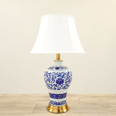Marrying practicality with exquisite aesthetics, this ceramic lamp presents a ribbed design accented with brass flawlessly fusing timeless and contemporary features. Topped with a stylish shade, the blue and white lamp emits a luminosity that harmonizes with any indoor design. Whether placed beside the living room couch or positioned by a beloved armchair, this refined lamp will infuse your surroundings with a hospitable glow.