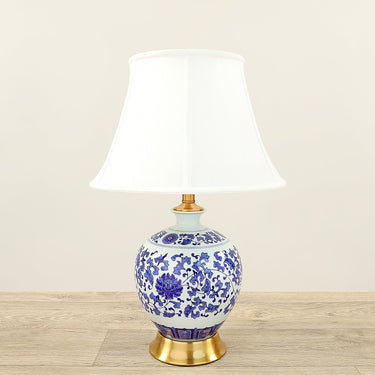 Marrying practicality with exquisite aesthetics, this ceramic lamp presents a ribbed design accented with brass flawlessly fusing timeless and contemporary features. Topped with a stylish shade, this blue and white lamp emits a luminosity that harmonizes with any indoor design. Whether placed beside the living room couch or positioned by a beloved armchair, this refined lamp will infuse your surroundings with a hospitable glow.