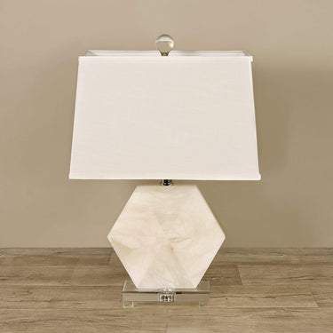 Add a touch of style to any nightstand or table with this one-of-a-kind lamp. This marble lamp features silver accents, a white rectangular shade, and a sturdy hexagonal base made of real white marble.